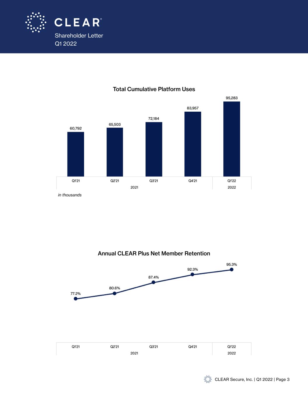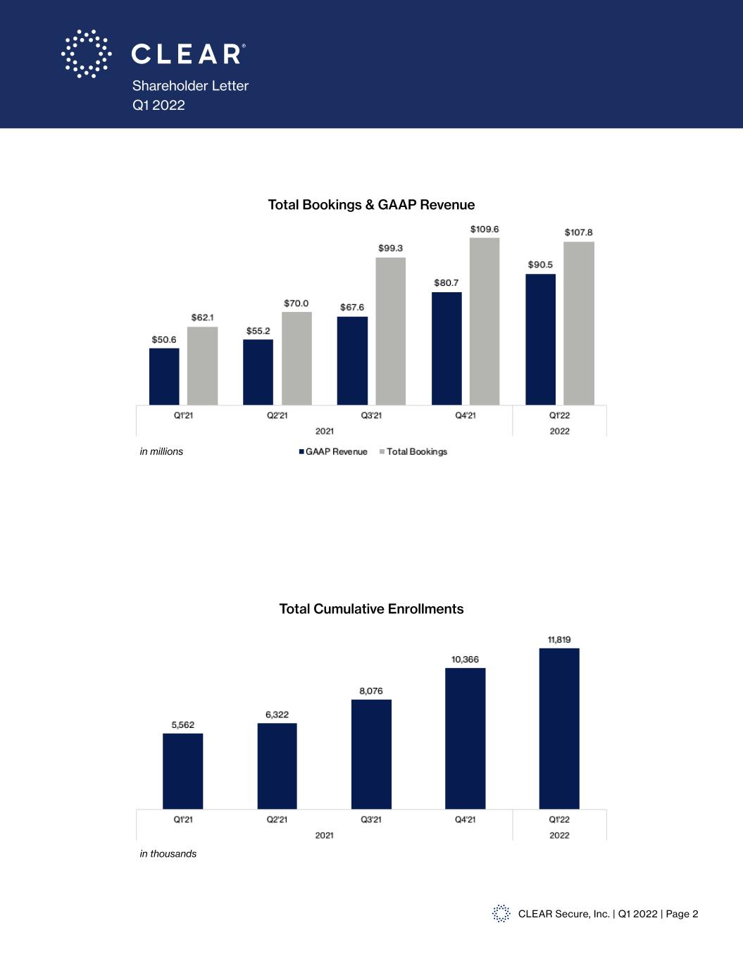CLEAR Secure, Inc. | Q1 2022 | Page 1 Shareholder Letter Q1 2022 First Quarter 2022 Financial Highlights (all figures are for First Quarter 2022 and percentage change is expressed as year-over-year, unless otherwise specified)* Revenue of $90.5 million was up 79.1% while Total Bookings of $107.8 million were up 73.5% Net cash provided by operating activities of $24.9 million; Free Cash Flow of $19.4 million Total Cumulative Enrollments of 11.8 million were up 112% year-over-year Annual CLEAR Plus Net Member Retention of 95.3% was up 1,810 basis points year-over-year and up 300 basis points sequentially Total Cumulative Platform Uses of 95.3 million were up 57% year-over-year Net Loss ($18.8) million; Adjusted Net Loss ($5.0) million; Adjusted EBITDA ($0.7) million Basic and Diluted Net Loss Per Share ($0.13); Adjusted Net Loss Per Share ($0.03) $100 million share repurchase authorized by CLEAR’s Board of Directors Launched Palm Springs International, Ontario International and San Diego International airports bringing total to 43 Launched virtual queueing in Phoenix International; now live in 6 airports *A reconciliation of non-GAAP financial measures to the most comparable GAAP measures is provided at the end of this letter. “ Our first quarter performance continued the broad-based strength experienced in our fourth quarter. The business saw operating leverage and generated strong free cash flow. We remain bullish on travel as people are allocating more discretionary spend to experiences, including travel.” —Caryn Seidman-Becker, CLEAR’s CEO