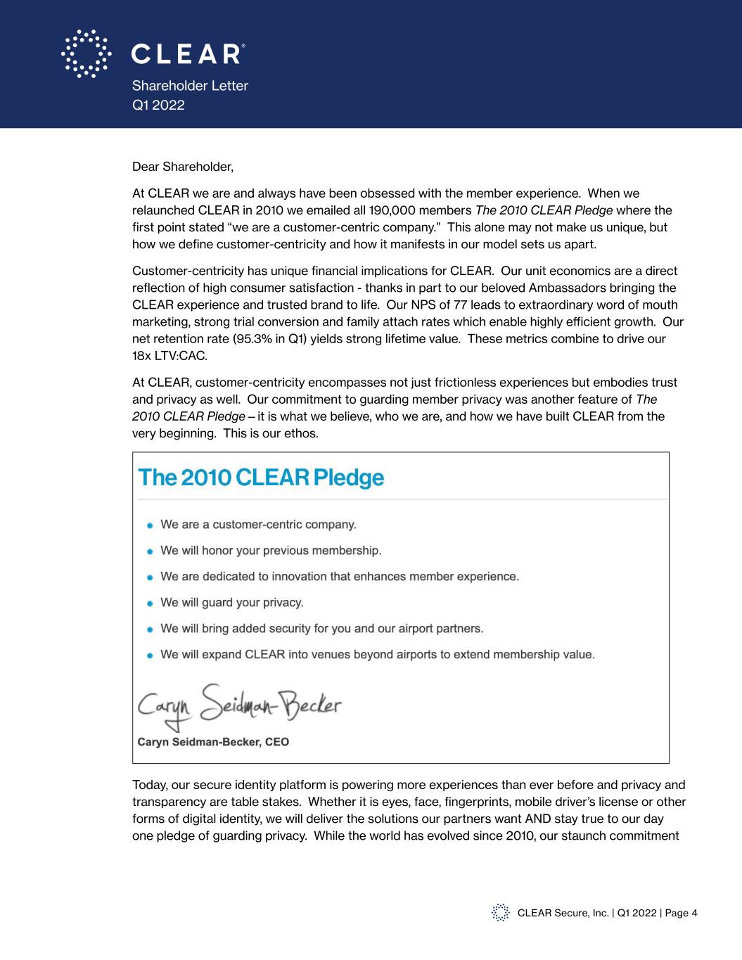 CLEAR Secure, Inc. | Q1 2022 | Page 4 Shareholder Letter Q1 2022 Dear Shareholder, At CLEAR we are and always have been obsessed with the member experience. When we relaunched CLEAR in 2010 we emailed all 190,000 members The 2010 CLEAR Pledge where the first point stated “we are a customer-centric company.” This alone may not make us unique, but how we define customer-centricity and how it manifests in our model sets us apart. Customer-centricity has unique financial implications for CLEAR. Our unit economics are a direct reflection of high consumer satisfaction - thanks in part to our beloved Ambassadors bringing the CLEAR experience and trusted brand to life. Our NPS of 77 leads to extraordinary word of mouth marketing, strong trial conversion and family attach rates which enable highly efficient growth. Our net retention rate (95.3% in Q1) yields strong lifetime value. These metrics combine to drive our 18x LTV:CAC. At CLEAR, customer-centricity encompasses not just frictionless experiences but embodies trust and privacy as well. Our commitment to guarding member privacy was another feature of The 2010 CLEAR Pledge—it is what we believe, who we are, and how we have built CLEAR from the very beginning. This is our ethos. • • Today, our secure identity platform is powering more experiences than ever before and privacy and transparency are table stakes. Whether it is eyes, face, fingerprints, mobile driver’s license or other forms of digital identity, we will deliver the solutions our partners want AND stay true to our day one pledge of guarding privacy. While the world has evolved since 2010, our staunch commitment