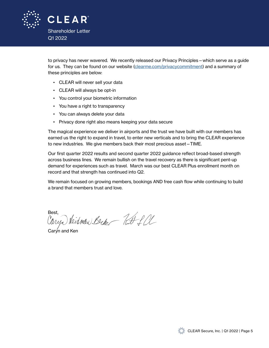 CLEAR Secure, Inc. | Q1 2022 | Page 5 Shareholder Letter Q1 2022 to privacy has never wavered. We recently released our Privacy Principles—which serve as a guide for us. They can be found on our website (clearme.com/privacycommitment) and a summary of these principles are below: • CLEAR will never sell your data • CLEAR will always be opt-in • You control your biometric information • You have a right to transparency • You can always delete your data • Privacy done right also means keeping your data secure The magical experience we deliver in airports and the trust we have built with our members has earned us the right to expand in travel, to enter new verticals and to bring the CLEAR experience to new industries. We give members back their most precious asset—TIME. Our first quarter 2022 results and second quarter 2022 guidance reflect broad-based strength across business lines. We remain bullish on the travel recovery as there is significant pent-up demand for experiences such as travel. March was our best CLEAR Plus enrollment month on record and that strength has continued into Q2. We remain focused on growing members, bookings AND free cash flow while continuing to build a brand that members trust and love. Best, Caryn and Ken