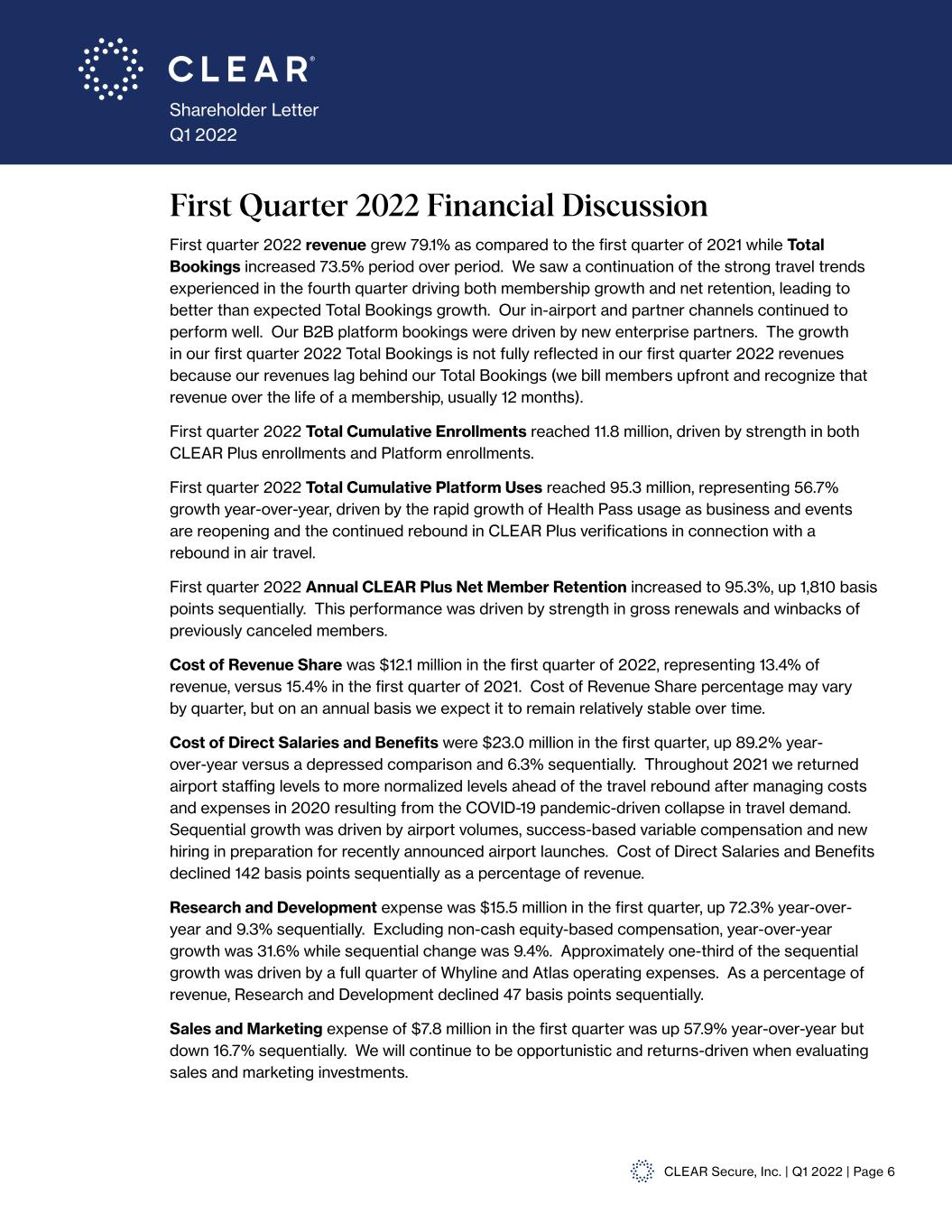 CLEAR Secure, Inc. | Q1 2022 | Page 6 Shareholder Letter Q1 2022 First Quarter 2022 Financial Discussion First quarter 2022 revenue grew 79.1% as compared to the first quarter of 2021 while Total Bookings increased 73.5% period over period. We saw a continuation of the strong travel trends experienced in the fourth quarter driving both membership growth and net retention, leading to better than expected Total Bookings growth. Our in-airport and partner channels continued to perform well. Our B2B platform bookings were driven by new enterprise partners. The growth in our first quarter 2022 Total Bookings is not fully reflected in our first quarter 2022 revenues because our revenues lag behind our Total Bookings (we bill members upfront and recognize that revenue over the life of a membership, usually 12 months). First quarter 2022 Total Cumulative Enrollments reached 11.8 million, driven by strength in both CLEAR Plus enrollments and Platform enrollments. First quarter 2022 Total Cumulative Platform Uses reached 95.3 million, representing 56.7% growth year-over-year, driven by the rapid growth of Health Pass usage as business and events are reopening and the continued rebound in CLEAR Plus verifications in connection with a rebound in air travel. First quarter 2022 Annual CLEAR Plus Net Member Retention increased to 95.3%, up 1,810 basis points sequentially. This performance was driven by strength in gross renewals and winbacks of previously canceled members. Cost of Revenue Share was $12.1 million in the first quarter of 2022, representing 13.4% of revenue, versus 15.4% in the first quarter of 2021. Cost of Revenue Share percentage may vary by quarter, but on an annual basis we expect it to remain relatively stable over time. Cost of Direct Salaries and Benefits were $23.0 million in the first quarter, up 89.2% year- over-year versus a depressed comparison and 6.3% sequentially. Throughout 2021 we returned airport staffing levels to more normalized levels ahead of the travel rebound after managing costs and expenses in 2020 resulting from the COVID-19 pandemic-driven collapse in travel demand. Sequential growth was driven by airport volumes, success-based variable compensation and new hiring in preparation for recently announced airport launches. Cost of Direct Salaries and Benefits declined 142 basis points sequentially as a percentage of revenue. Research and Development expense was $15.5 million in the first quarter, up 72.3% year-over- year and 9.3% sequentially. Excluding non-cash equity-based compensation, year-over-year growth was 31.6% while sequential change was 9.4%. Approximately one-third of the sequential growth was driven by a full quarter of Whyline and Atlas operating expenses. As a percentage of revenue, Research and Development declined 47 basis points sequentially. Sales and Marketing expense of $7.8 million in the first quarter was up 57.9% year-over-year but down 16.7% sequentially. We will continue to be opportunistic and returns-driven when evaluating sales and marketing investments.