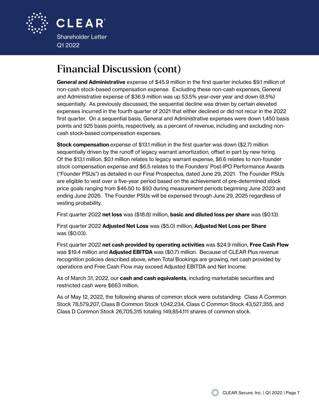CLEAR Secure, Inc. | Q1 2022 | Page 7 Shareholder Letter Q1 2022 Financial Discussion (cont) General and Administrative expense of $45.9 million in the first quarter includes $9.1 million of non-cash stock-based compensation expense. Excluding these non-cash expenses, General and Administrative expense of $36.9 million was up 53.5% year-over year and down (8.5%) sequentially. As previously discussed, the sequential decline was driven by certain elevated expenses incurred in the fourth quarter of 2021 that either declined or did not recur in the 2022 first quarter. On a sequential basis, General and Administrative expenses were down 1,450 basis points and 925 basis points, respectively, as a percent of revenue, including and excluding non- cash stock-based compensation expenses. Stock compensation expense of $13.1 million in the first quarter was down ($2.7) million sequentially driven by the runoff of legacy warrant amortization, offset in part by new hiring. Of the $13.1 million, $0.1 million relates to legacy warrant expense, $6.6 relates to non-founder stock compensation expense and $6.5 relates to the Founders’ Post-IPO Performance Awards (“Founder PSUs”) as detailed in our Final Prospectus, dated June 29, 2021. The Founder PSUs are eligible to vest over a five-year period based on the achievement of pre-determined stock price goals ranging from $46.50 to $93 during measurement periods beginning June 2023 and ending June 2026. The Founder PSUs will be expensed through June 29, 2025 regardless of vesting probability. First quarter 2022 net loss was ($18.8) million, basic and diluted loss per share was ($0.13). First quarter 2022 Adjusted Net Loss was ($5.0) million, Adjusted Net Loss per Share was ($0.03). First quarter 2022 net cash provided by operating activities was $24.9 million, Free Cash Flow was $19.4 million and Adjusted EBITDA was ($0.7) million. Because of CLEAR Plus revenue recognition policies described above, when Total Bookings are growing, net cash provided by operations and Free Cash Flow may exceed Adjusted EBITDA and Net Income. As of March 31, 2022, our cash and cash equivalents, including marketable securities and restricted cash were $663 million. As of May 12, 2022, the following shares of common stock were outstanding: Class A Common Stock 78,579,207, Class B Common Stock 1,042,234, Class C Common Stock 43,527,355, and Class D Common Stock 26,705,315 totaling 149,854,111 shares of common stock.