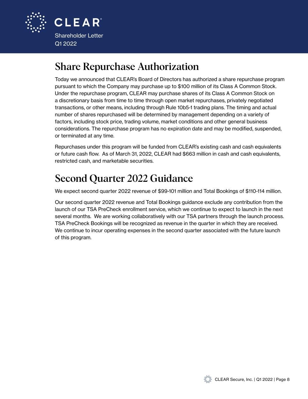CLEAR Secure, Inc. | Q1 2022 | Page 8 Shareholder Letter Q1 2022 Share Repurchase Authorization Today we announced that CLEAR’s Board of Directors has authorized a share repurchase program pursuant to which the Company may purchase up to $100 million of its Class A Common Stock. Under the repurchase program, CLEAR may purchase shares of its Class A Common Stock on a discretionary basis from time to time through open market repurchases, privately negotiated transactions, or other means, including through Rule 10b5-1 trading plans. The timing and actual number of shares repurchased will be determined by management depending on a variety of factors, including stock price, trading volume, market conditions and other general business considerations. The repurchase program has no expiration date and may be modified, suspended, or terminated at any time. Repurchases under this program will be funded from CLEAR’s existing cash and cash equivalents or future cash flow. As of March 31, 2022, CLEAR had $663 million in cash and cash equivalents, restricted cash, and marketable securities. Second Quarter 2022 Guidance We expect second quarter 2022 revenue of $99-101 million and Total Bookings of $110-114 million. Our second quarter 2022 revenue and Total Bookings guidance exclude any contribution from the launch of our TSA PreCheck enrollment service, which we continue to expect to launch in the next several months. We are working collaboratively with our TSA partners through the launch process. TSA PreCheck Bookings will be recognized as revenue in the quarter in which they are received. We continue to incur operating expenses in the second quarter associated with the future launch of this program.