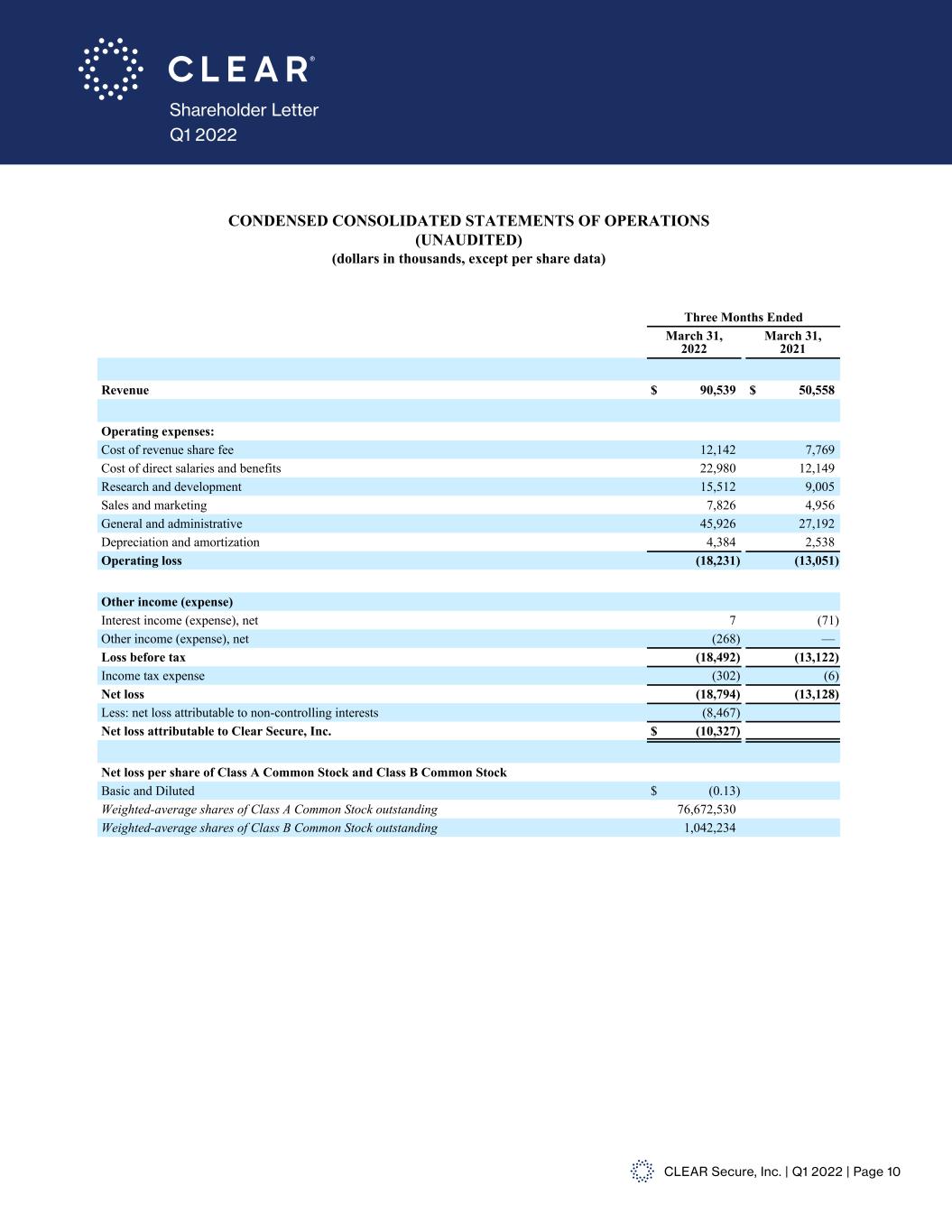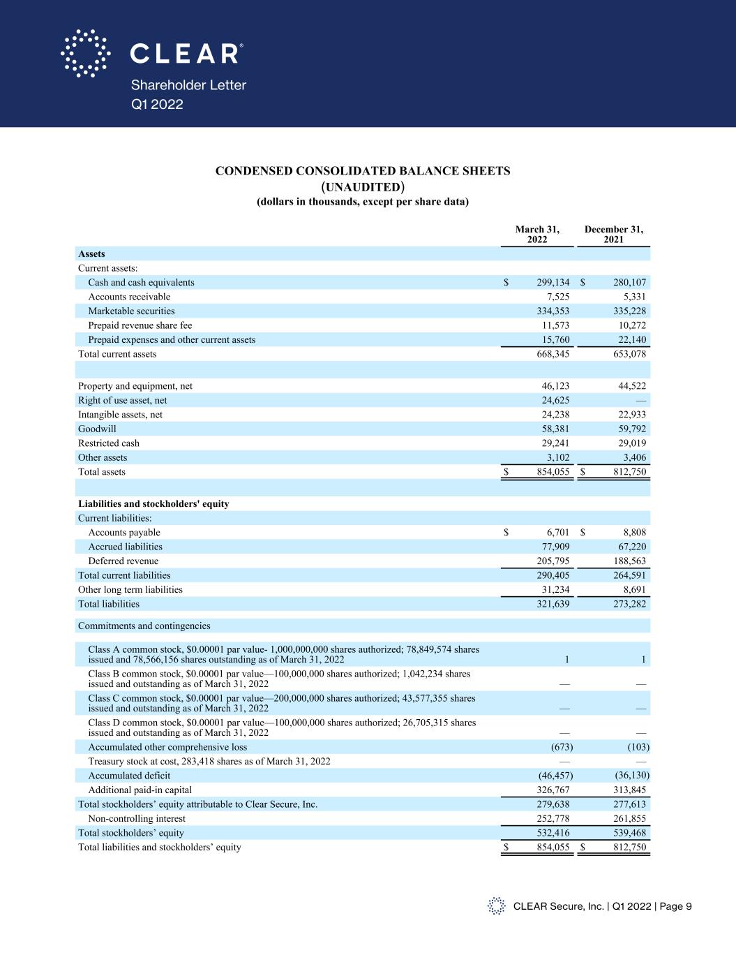 CLEAR Secure, Inc. | Q1 2022 | Page 9 Shareholder Letter Q1 2022 CLEAR SECURE, INC. CONDENSED CONSOLIDATED BALANCE SHEETS (UNAUDITED) (dollars in thousands, except per share data) March 31, 2022 December 31, 2021 Assets Current assets: Cash and cash equivalents $ 299,134 $ 280,107 Accounts receivable 7,525 5,331 Marketable securities 334,353 335,228 Prepaid revenue share fee 11,573 10,272 Prepaid expenses and other current assets 15,760 22,140 Total current assets 668,345 653,078 Property and equipment, net 46,123 44,522 Right of use asset, net 24,625 — Intangible assets, net 24,238 22,933 Goodwill 58,381 59,792 Restricted cash 29,241 29,019 Other assets 3,102 3,406 Total assets $ 854,055 $ 812,750 Liabilities and stockholders' equity Current liabilities: Accounts payable $ 6,701 $ 8,808 Accrued liabilities 77,909 67,220 Deferred revenue 205,795 188,563 Total current liabilities 290,405 264,591 Other long term liabilities 31,234 8,691 Total liabilities 321,639 273,282 Commitments and contingencies Class A common stock, $0.00001 par value- 1,000,000,000 shares authorized; 78,849,574 shares issued and 78,566,156 shares outstanding as of March 31, 2022 1 1 Class B common stock, $0.00001 par value—100,000,000 shares authorized; 1,042,234 shares issued and outstanding as of March 31, 2022 — — Class C common stock, $0.00001 par value—200,000,000 shares authorized; 43,577,355 shares issued and outstanding as of March 31, 2022 — — Class D common stock, $0.00001 par value—100,000,000 shares authorized; 26,705,315 shares issued and outstanding as of March 31, 2022 — — Accumulated other comprehensive loss (673) (103) Treasury stock at cost, 283,418 shares as of March 31, 2022 — — Accumulated deficit (46,457) (36,130) Additional paid-in capital 326,767 313,845 Total stockholders’ equity attributable to Clear Secure, Inc. 279,638 277,613 Non-controlling interest 252,778 261,855 Total stockholders’ equity 532,416 539,468 Total liabilities and stockholders’ equity $ 854,055 $ 812,750