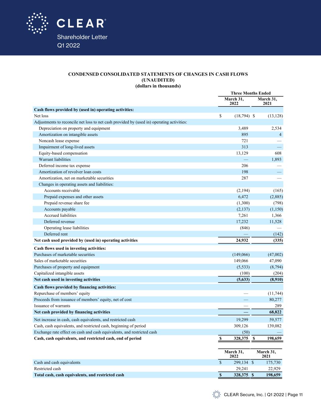 CLEAR Secure, Inc. | Q1 2022 | Page 11 Shareholder Letter Q1 2022 CLEAR SECURE, INC. CONDENSED CONSOLIDATED STATEMENTS OF CHANGES IN CASH FLOWS (UNAUDITED) (dollars in thousands) Three Months Ended March 31, 2022 March 31, 2021 Cash flows provided by (used in) operating activities: Net loss $ (18,794) $ (13,128) Adjustments to reconcile net loss to net cash provided by (used in) operating activities: Depreciation on property and equipment 3,489 2,534 Amortization on intangible assets 895 4 Noncash lease expense 721 — Impairment of long-lived assets 313 — Equity-based compensation 13,129 608 Warrant liabilities — 1,893 Deferred income tax expense 206 — Amortization of revolver loan costs 198 — Amortization, net on marketable securities 287 — Changes in operating assets and liabilities: Accounts receivable (2,194) (165) Prepaid expenses and other assets 6,472 (2,885) Prepaid revenue share fee (1,300) (798) Accounts payable (2,137) (1,150) Accrued liabilities 7,261 1,366 Deferred revenue 17,232 11,528 Operating lease liabilities (846) — Deferred rent — (142) Net cash used provided by (used in) operating activities 24,932 (335) Cash flows used in investing activities: Purchases of marketable securities (149,066) (47,002) Sales of marketable securities 149,066 47,090 Purchases of property and equipment (5,533) (8,794) Capitalized intangible assets (100) (204) Net cash used in investing activities (5,633) (8,910) Cash flows provided by financing activities: Repurchase of members’ equity — (11,744) Proceeds from issuance of members’ equity, net of cost — 80,277 Issuance of warrants — 289 Net cash provided by financing activities — 68,822 Net increase in cash, cash equivalents, and restricted cash 19,299 59,577 Cash, cash equivalents, and restricted cash, beginning of period 309,126 139,082 Exchange rate effect on cash and cash equivalents, and restricted cash (50) — Cash, cash equivalents, and restricted cash, end of period $ 328,375 $ 198,659 March 31, 2022 March 31, 2021 Cash and cash equivalents $ 299,134 $ 175,730 Restricted cash 29,241 22,929 Total cash, cash equivalents, and restricted cash $ 328,375 $ 198,659