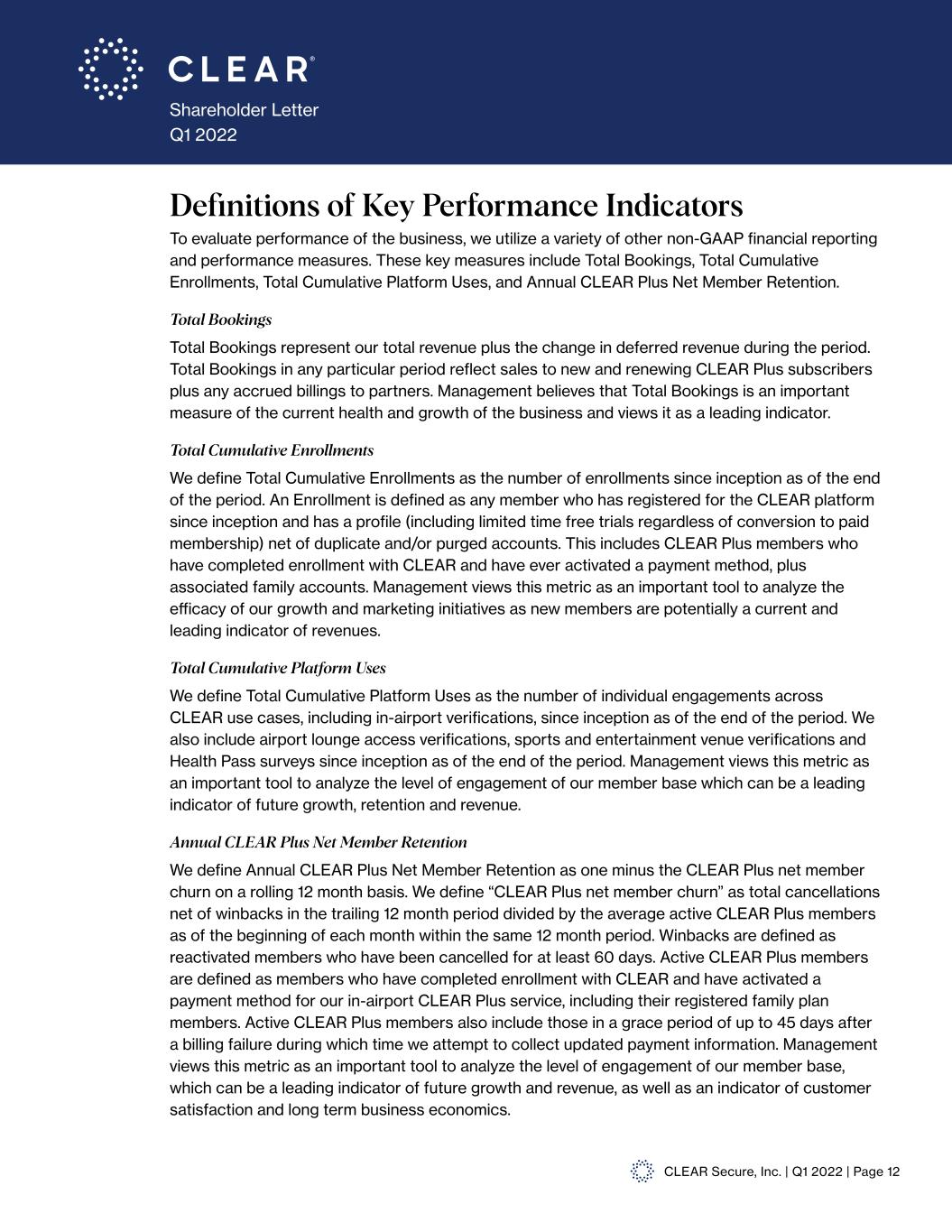 CLEAR Secure, Inc. | Q1 2022 | Page 12 Shareholder Letter Q1 2022 Definitions of Key Performance Indicators To evaluate performance of the business, we utilize a variety of other non-GAAP financial reporting and performance measures. These key measures include Total Bookings, Total Cumulative Enrollments, Total Cumulative Platform Uses, and Annual CLEAR Plus Net Member Retention. Total Bookings Total Bookings represent our total revenue plus the change in deferred revenue during the period. Total Bookings in any particular period reflect sales to new and renewing CLEAR Plus subscribers plus any accrued billings to partners. Management believes that Total Bookings is an important measure of the current health and growth of the business and views it as a leading indicator. Total Cumulative Enrollments We define Total Cumulative Enrollments as the number of enrollments since inception as of the end of the period. An Enrollment is defined as any member who has registered for the CLEAR platform since inception and has a profile (including limited time free trials regardless of conversion to paid membership) net of duplicate and/or purged accounts. This includes CLEAR Plus members who have completed enrollment with CLEAR and have ever activated a payment method, plus associated family accounts. Management views this metric as an important tool to analyze the efficacy of our growth and marketing initiatives as new members are potentially a current and leading indicator of revenues. Total Cumulative Platform Uses We define Total Cumulative Platform Uses as the number of individual engagements across CLEAR use cases, including in-airport verifications, since inception as of the end of the period. We also include airport lounge access verifications, sports and entertainment venue verifications and Health Pass surveys since inception as of the end of the period. Management views this metric as an important tool to analyze the level of engagement of our member base which can be a leading indicator of future growth, retention and revenue. Annual CLEAR Plus Net Member Retention We define Annual CLEAR Plus Net Member Retention as one minus the CLEAR Plus net member churn on a rolling 12 month basis. We define “CLEAR Plus net member churn” as total cancellations net of winbacks in the trailing 12 month period divided by the average active CLEAR Plus members as of the beginning of each month within the same 12 month period. Winbacks are defined as reactivated members who have been cancelled for at least 60 days. Active CLEAR Plus members are defined as members who have completed enrollment with CLEAR and have activated a payment method for our in-airport CLEAR Plus service, including their registered family plan members. Active CLEAR Plus members also include those in a grace period of up to 45 days after a billing failure during which time we attempt to collect updated payment information. Management views this metric as an important tool to analyze the level of engagement of our member base, which can be a leading indicator of future growth and revenue, as well as an indicator of customer satisfaction and long term business economics.
