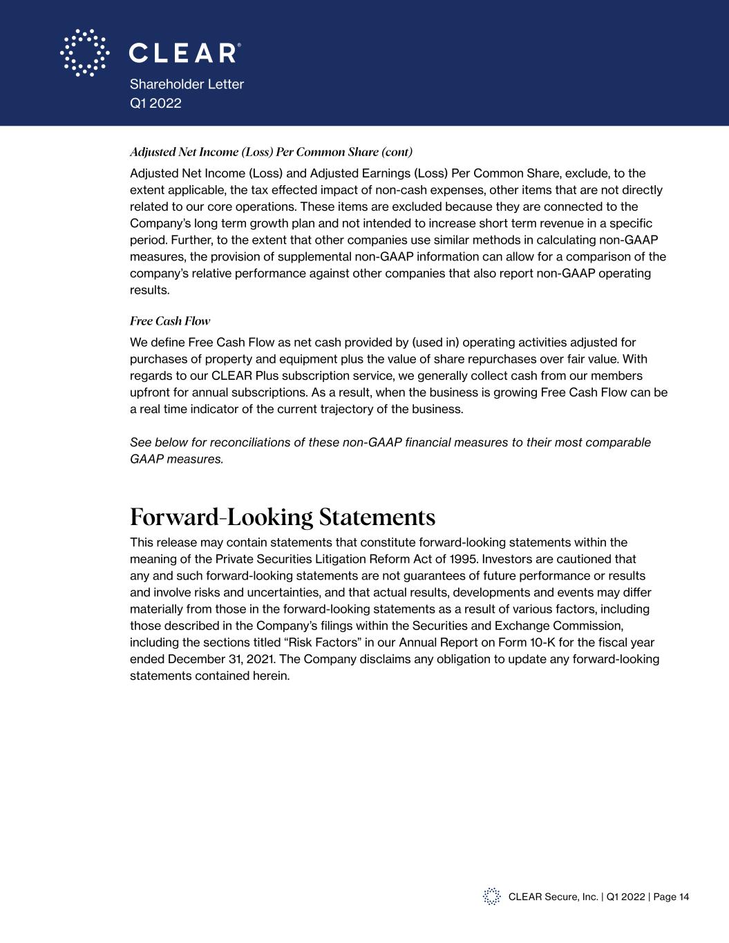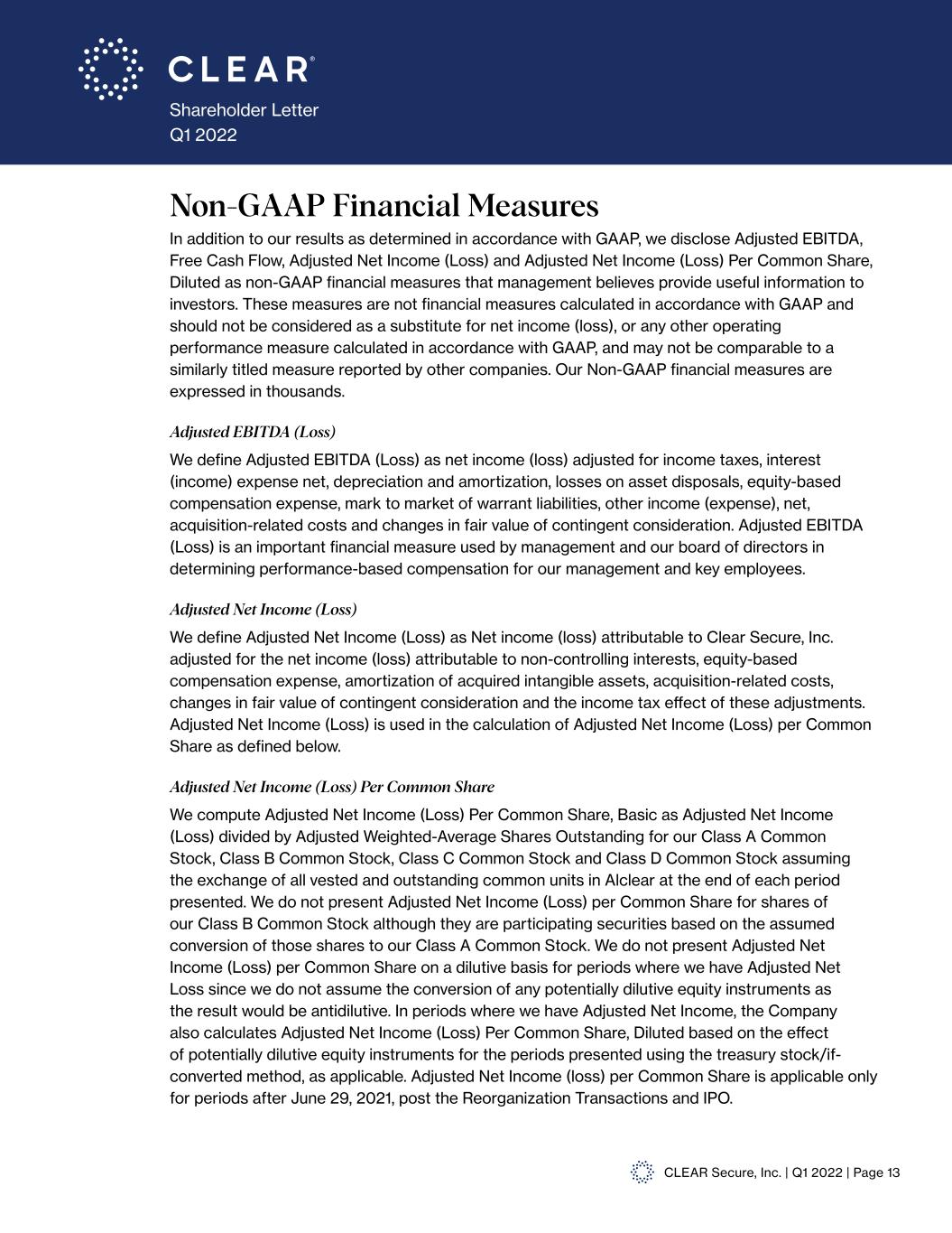 CLEAR Secure, Inc. | Q1 2022 | Page 13 Shareholder Letter Q1 2022 Non-GAAP Financial Measures In addition to our results as determined in accordance with GAAP, we disclose Adjusted EBITDA, Free Cash Flow, Adjusted Net Income (Loss) and Adjusted Net Income (Loss) Per Common Share, Diluted as non-GAAP financial measures that management believes provide useful information to investors. These measures are not financial measures calculated in accordance with GAAP and should not be considered as a substitute for net income (loss), or any other operating performance measure calculated in accordance with GAAP, and may not be comparable to a similarly titled measure reported by other companies. Our Non-GAAP financial measures are expressed in thousands. Adjusted EBITDA (Loss) We define Adjusted EBITDA (Loss) as net income (loss) adjusted for income taxes, interest (income) expense net, depreciation and amortization, losses on asset disposals, equity-based compensation expense, mark to market of warrant liabilities, other income (expense), net, acquisition-related costs and changes in fair value of contingent consideration. Adjusted EBITDA (Loss) is an important financial measure used by management and our board of directors in determining performance-based compensation for our management and key employees. Adjusted Net Income (Loss) We define Adjusted Net Income (Loss) as Net income (loss) attributable to Clear Secure, Inc. adjusted for the net income (loss) attributable to non-controlling interests, equity-based compensation expense, amortization of acquired intangible assets, acquisition-related costs, changes in fair value of contingent consideration and the income tax effect of these adjustments. Adjusted Net Income (Loss) is used in the calculation of Adjusted Net Income (Loss) per Common Share as defined below. Adjusted Net Income (Loss) Per Common Share We compute Adjusted Net Income (Loss) Per Common Share, Basic as Adjusted Net Income (Loss) divided by Adjusted Weighted-Average Shares Outstanding for our Class A Common Stock, Class B Common Stock, Class C Common Stock and Class D Common Stock assuming the exchange of all vested and outstanding common units in Alclear at the end of each period presented. We do not present Adjusted Net Income (Loss) per Common Share for shares of our Class B Common Stock although they are participating securities based on the assumed conversion of those shares to our Class A Common Stock. We do not present Adjusted Net Income (Loss) per Common Share on a dilutive basis for periods where we have Adjusted Net Loss since we do not assume the conversion of any potentially dilutive equity instruments as the result would be antidilutive. In periods where we have Adjusted Net Income, the Company also calculates Adjusted Net Income (Loss) Per Common Share, Diluted based on the effect of potentially dilutive equity instruments for the periods presented using the treasury stock/if- converted method, as applicable. Adjusted Net Income (loss) per Common Share is applicable only for periods after June 29, 2021, post the Reorganization Transactions and IPO.