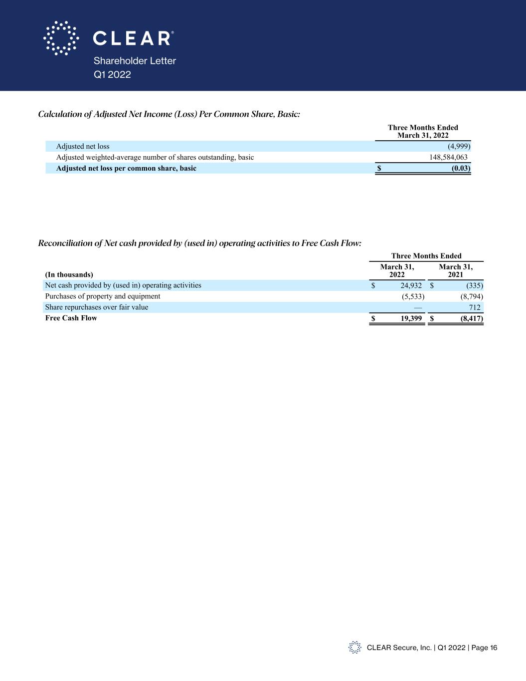 CLEAR Secure, Inc. | Q1 2022 | Page 15 Shareholder Letter Q1 2022 Three Months Ended (In thousands) March 31, 2022 March 31, 2021 Net loss $ (18,794) $ (13,128) Income taxes 302 6 Interest (income) expense, net (7) 71 Other (income) expense, net 268 — Depreciation and amortization 4,384 2,538 Equity-based compensation expense 13,129 1,319 Warrant liabilities — 1,893 Adjusted EBITDA (Loss) $ (718) $ (7,301) Reconciliation of Net Income (Loss) to Adjusted Net Income (Loss) Three Months Ended (In thousands) March 31, 2022 March 31, 2021 Net loss attributable to Clear Secure, Inc. $ (10,327) $ — Reallocation of net loss attributable to non-controlling interests (8,467) — Net loss per above (18,794) (13,128) Equity-based compensation expense 13,129 608 Amortization of acquired intangibles 869 — Income tax (expense) benefit (203) — Adjusted Net Loss $ (4,999) $ (12,520) As stated above, due to the Company incurring a net loss for the periods presented, the Company has not calculated Adjusted Weighted-Average Shares Outstanding, Dilutive. Calculation of Adjusted Weighted-Average Shares Outstanding As of March 31, 2022 As of March 31, 2021 Weighted-average number of shares outstanding, basic for Class A Common Stock 76,672,530 — Adjustments Assumed weighted-average conversion of issued and outstanding Class B Common Stock 1,042,234 — Assumed weighted-average conversion of issued and outstanding Class C Common Stock 44,000,927 — Assumed weighted-average conversion of issued and outstanding Class D Common Stock 26,705,415 — Assumed weighted-average conversion of vested and outstanding warrants 162,957 — Adjusted Weighted-Average Number of Shares Outstanding, Basic 148,584,063 — Calculation of Adjusted Net Income (Loss) Per Common Share, Basic Three Months Ended March 31, 2022 Adjusted net loss (4,999) Adjusted weighted-average number of shares outstanding, basic 148,584,063 Adjusted net loss per common share, basic $ (0.03) Reconciliation of Net cash provided by (used in) operating activities to Free Cash Flow: Three Months Ended (In thousands) March 31, 2022 March 31, 2021 Net loss $ (18,794) $ (13,128) Income taxes 302 6 Interest (income) expense, net (7) 71 Other (income) expense, net 268 — Depreciation and amortization 4,384 2,538 Equity-based compensation expense 13,129 1,319 Warrant liabilities — 1,893 Adjusted EBITDA (Loss) $ (718) $ (7,301) Reconciliation of Net Income (Loss) to Adjusted Net Income (Loss) Three Months Ended (In thousands) March 31, 2022 March 31, 2021 Net loss attributable to Clear Secure, Inc. $ (10,327) $ — Reallocation of net loss attributable to non-controlling interests (8,467) — Net loss per above (18,794) (13,128) Equity-based compensation expense 13,129 608 Amortization of acquired intangibles 869 Income tax (expense) benefit (203) — Adjusted Net Loss $ (4,999) $ (12,520) As stated above, due to the Company incurring a net loss for the periods presented, the Company has not calculated Adjusted Weighted-Average Shares Outstanding, Dilutive. Calculation of Adjusted Weighted-Average Shares Outstanding As of March 31, 2022 As of March 31, 2021 Weighted-average number of shares outstanding, basic for Class A Common Stock 76,672,530 — Adjustments Assumed weighted-average conversion of issued and outstanding Class B Common Stock 1,042,234 — Assumed weighted-average conversion of issued and outstanding Class C Common Stock 44,000,927 ssumed weighted-average conversion of issued and outstanding Class D Common Stock 26,705,415 — ssu ed eighted-average conversion of vested and outstanding warrants 162,957 djusted Weighted-Average Number of Shares Outstanding, Basic 148,584,063 Calculation of Adjusted Net Income (Loss) Per Common Share, Basic Three Months Ended March 31, 2022 Adjusted net loss (4,999) Adjusted weighted-average number of shares outstanding, basic 148,584,063 Adjusted net loss per common share, basic $ (0.03) Reconciliation of Net cash provided by (used in) operating activities to Free Cash Flow: Reconciliation of Net Income (Loss) to Adjusted EBITDA: Reconciliation of Net Income (Loss) t j ste et I c e (Loss): Calculation of Adjusted Weighted-Aver ge Shares Outst nding: Three Months Ended (In thousands March 31, 2022 March 31, 2021 N t loss $ (18,79 ) $ (13,12 ) Income t x s 302 6 Interest (income) expense, net (7) 71 Other (income) expense, net 26 — Depreciation and amortization 4,384 2,538 Equity-based compensation exp nse 13,129 1,319 Warrant liabilities — 1,893 Adjusted EBITDA (Loss) $ (718) $ (7,301) Reconciliation of Net Income (Loss) to Adjusted Net Income (Loss) Three Months Ended (In thousan s) March 31, 2022 March 31, 2021 Net loss attributable to Clear Secur , Inc. $ (10,327) $ Reallocation of net loss attr butable to non-controlling interests (8,467 Net loss per above (18,7 4 3,1 8 Equity-based compensation expense 13,129 608 Amortization of acquired intangibles 869 Income tax (expense) benefit (203) — Adjusted Net Loss $ (4,999) $ (12,520) As stated above, due to the Company incurring a net loss for the periods presented, the Company has not calculated Adjusted Weighted-Average Shares Outstanding, Dilutive. Calculation of Adjusted Weighted-Average Shares Outstanding As of March 31, 2022 As of March 31, 2021 Weighte -average number of share utstanding, basic for Class A Common Stock 7 ,672,530 Adj stments Ass m weighted-average conversion of issued and outstanding Class B Common Stock 1,042,234 Assumed weighted-average conversion of issued and outstanding Class C Common Stock 44,000,927 Assumed weighted-average conversion of issued and outstanding Class D Common Stock 26,705,415 Assumed weighted-average conversion of vested and outstanding warrants 162,957 Adjusted Weighted-Average Number of Shares Outstanding, Basic 148,584,063 — Calculation of Adjusted N t Income (Loss) Per Common Share, Basic Three Months Ended March 31, 2022 Adjusted net loss (4,999) Adjusted weighted-average number of shares outst