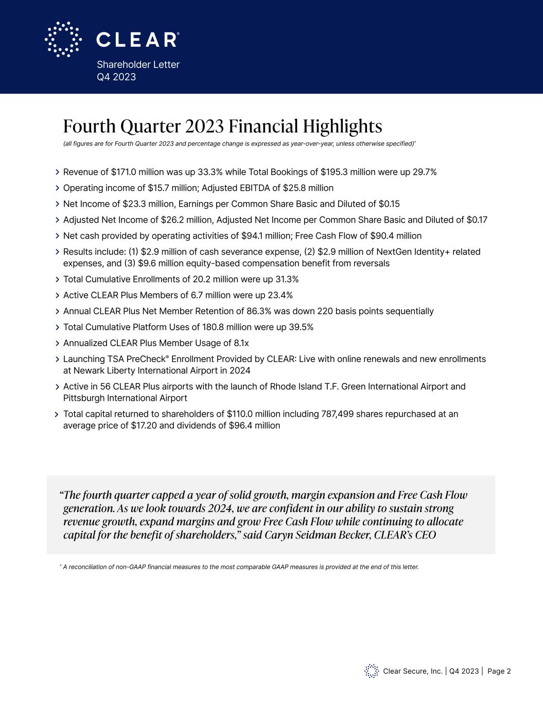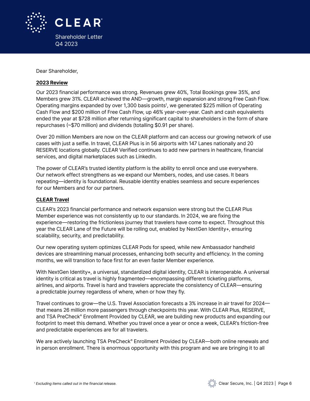 Clear Secure, Inc. | Q4 2023 | Page 6 Shareholder Letter Q4 2023 Dear Shareholder, 2023 Review Our 2023 financial performance was strong. Revenues grew 40%, Total Bookings grew 35%, and Members grew 31%. CLEAR achieved the AND—growth, margin expansion and strong Free Cash Flow. Operating margins expanded by over 1,300 basis points1, we generated $225 million of Operating Cash Flow and $200 million of Free Cash Flow, up 46% year-over-year. Cash and cash equivalents ended the year at $728 million after returning significant capital to shareholders in the form of share repurchases (~$70 million) and dividends (totalling $0.91 per share). Over 20 million Members are now on the CLEAR platform and can access our growing network of use cases with just a selfie. In travel, CLEAR Plus is in 56 airports with 147 Lanes nationally and 20 RESERVE locations globally. CLEAR Verified continues to add new partners in healthcare, financial services, and digital marketplaces such as LinkedIn. The power of CLEAR’s trusted identity platform is the ability to enroll once and use everywhere. Our network effect strengthens as we expand our Members, nodes, and use cases. It bears repeating—identity is foundational. Reusable identity enables seamless and secure experiences for our Members and for our partners. CLEAR Travel CLEAR’s 2023 financial performance and network expansion were strong but the CLEAR Plus Member experience was not consistently up to our standards. In 2024, we are fixing the experience—restoring the frictionless journey that travelers have come to expect. Throughout this year the CLEAR Lane of the Future will be rolling out, enabled by NextGen Identity+, ensuring scalability, security, and predictability. Our new operating system optimizes CLEAR Pods for speed, while new Ambassador handheld devices are streamlining manual processes, enhancing both security and efficiency. In the coming months, we will transition to face first for an even faster Member experience. With NextGen Identity+, a universal, standardized digital identity, CLEAR is interoperable. A universal identity is critical as travel is highly fragmented—encompassing different ticketing platforms, airlines, and airports. Travel is hard and travelers appreciate the consistency of CLEAR—ensuring a predictable journey regardless of where, when or how they fly. Travel continues to grow—the U.S. Travel Association forecasts a 3% increase in air travel for 2024— that means 26 million more passengers through checkpoints this year. With CLEAR Plus, RESERVE, and TSA PreCheck® Enrollment Provided by CLEAR, we are building new products and expanding our footprint to meet this demand. Whether you travel once a year or once a week, CLEAR’s friction-free and predictable experiences are for all travelers. We are actively launching TSA PreCheck® Enrollment Provided by CLEAR—both online renewals and in person enrollment. There is enormous opportunity with this program and we are bringing it to all 1 Excluding items called out in the financial release.