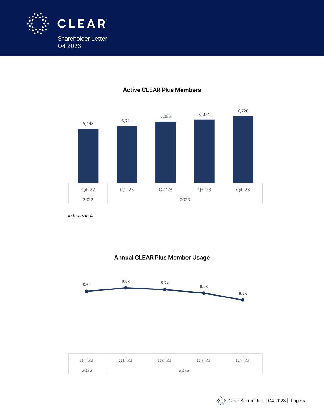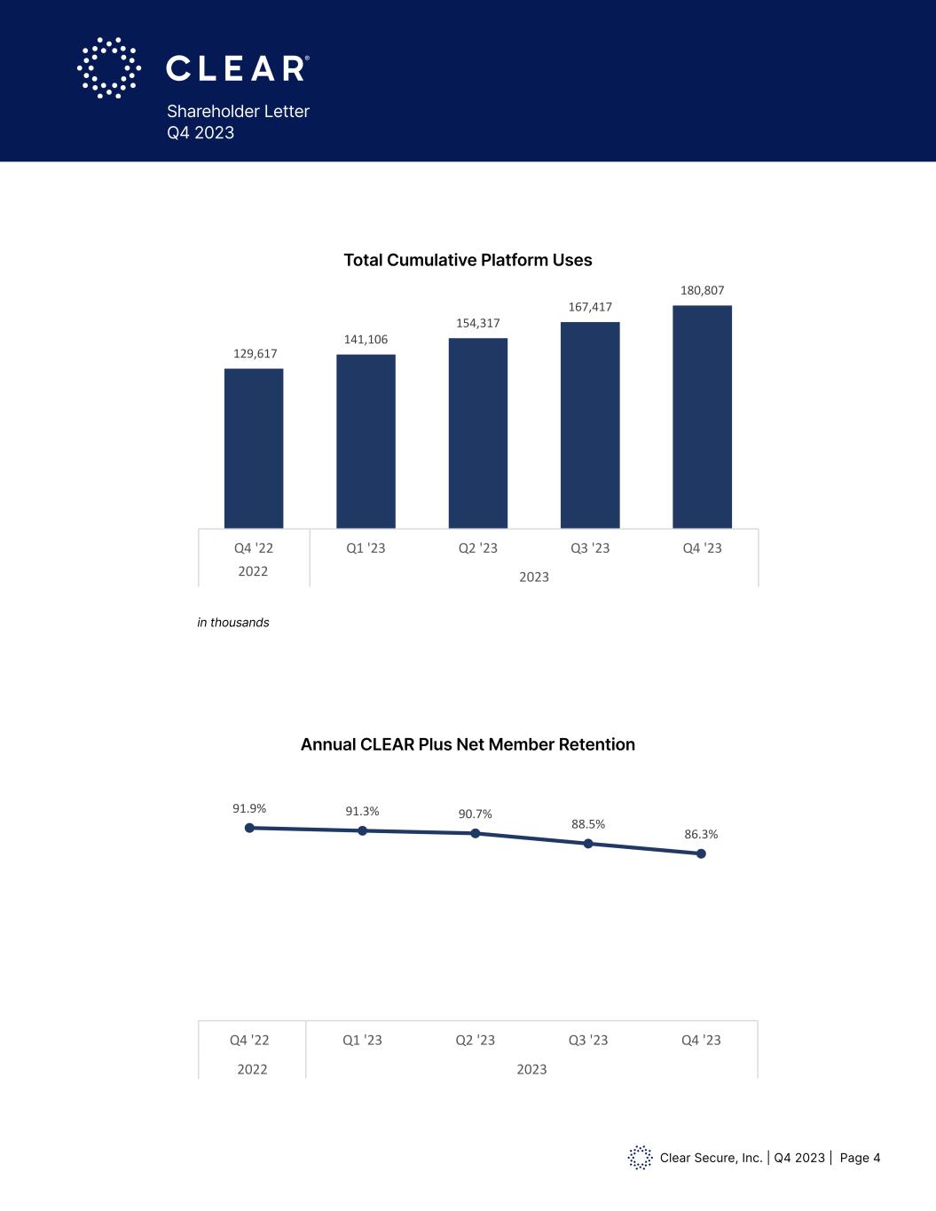 Clear Secure, Inc. | Q4 2023 | Page 5 Shareholder Letter Q4 2023 Active CLEAR Plus Members Annual CLEAR Plus Member Usage in thousands $102.7 $115.9 $128.3 $132.4 $149.9 $160.4 $122.9 $145.7 $150.6 $149.7 $175.1 $191.7 Q2 '22 Q3 '22 Q4 '22 Q1 '23 Q2 '23 Q3 '23 2022 2023 Total GAAP Revenue & Bookings 13,097 14,236 15,384 16,202 17,385 18,594 Q2 '22 Q3 '22 Q4 '22 Q1 '23 Q2 '23 Q3 '23 2022 2023 Total Cumulative Enrollments (Thousands) 106,631 117,620 129,617 141,106 154,317 167,417 Q2 '22 Q3 '22 Q4 '22 Q1 '23 Q2 '23 Q3 '23 2022 2023 Total Cumulative Platform Uses (Thousands) Q2 '22 92.2% 91.9% 91.3% 90.7% 88.5% 86.3% Q3 '22 Q4 '22 Q1 '23 Q2 '23 Q3 '23 Q4 '23 2022 2023 Annual CLEAR Plus Member Retention 4,855 5,448 5,711 6,183 6,374 6,720 Q3 '22 4 1 3 2 3 3 ' 4 ' 2022 2023 Acitve CLEAR Plus Members (Thousands) 8.6x 8.6x 8.8x 8.7x 8.5x 8.1x Q3 '22 Q4 '22 Q1 '23 Q2 '23 Q3 '23 Q4 '23 2022 2023 Annualized CLEAR Plus Member Usage 92.2% 91.9% 91.3% 90.7% 88.5% 86.3% Q3 '22 Q4 '22 Q1 '23 Q2 '23 Q3 '23 Q4 '23 2022 2023 Annual CLEAR Plus M mber Retention 4,855 5,448 5,711 6,183 6,374 6,720 Q3 '22 Q4 '22 Q1 '23 Q2 '23 Q3 '23 Q4 '23 2022 2023 Acitve CLEAR Plus Members (Thousands) 8.6x 8.6x 8.8x 8.7x 8.5x 8.1x Q3 '22 Q4 '22 Q1 '23 Q2 '23 Q3 '23 Q4 '23 2022 2023 Annualized CLEAR Plus Member Usage $102.7 $115.9 $128.3 $132.4 $149.9 $160.4 $122.9 $145.7 $150.6 $149.7 $175.1 $191.7 Q2 '22 Q3 '22 Q4 '22 Q1 '23 Q2 '23 Q3 '23 2022 2023 Total GAAP Revenue & Bookings 13,097 14,236 15,384 16,202 17,385 18,594 Q2 '22 Q3 '22 Q4 '22 Q1 '23 Q2 '23 Q3 '23 2022 2023 Total Cumulative Enrollments (Thousands) 106,631 117,620 129,617 141,106 154,317 167,417 Q2 '22 Q3 '22 Q4 '22 Q1 '23 Q2 '23 Q3 '23 2022 2023 Total Cumulative Platform Uses (Thousands) Q2 '22 92.2% 91.9% 91.3% 90.7% 88.5% 86.3% Q3 '22 Q4 '22 Q1 '23 Q2 '23 Q3 '23 Q4 '23 2022 2023 Annual CLEAR Plus Member Retentio 4,855 5,448 5,711 6,18 6,374 6,720 Q3 '22 Q4 '2 Q1 '23 Q2 '23 Q3 '23 Q4 '23 2022 2023 Acitve CLEAR Plus Members (Thousands) 8.6x 8.6x 8.8x 8.7x 8.5x 8.1x Q3 '22 Q4 '22 Q1 '23 Q2 '23 Q3 '23 Q4 '23 2022 2023 Annualized CLEAR Plus Memb r Usage 92.2% 91.9% 91.3% 90.7% 88.5% 86.3% Q3 '22 Q4 '22 Q1 '23 Q2 '23 Q3 '23 Q4 '23 2022 2023 Annual CLEAR Plus M mber Retention 4,855 5,448 5,711 6,183 6,374 6,720 Q3 '22 Q4 '22 Q1 '23 Q2 '23 Q3 '23 Q4 '23 2022 2023 Acitve CLEAR Pl s Members (Thousands) 8.6x 8.6x 8.8x 8.7x 8.5x 8.1x Q3 '22 Q4 '22 Q1 '23 Q2 '23 Q3 '23 Q4 '23 2022 2023 Annualized LEAR Plus Member age