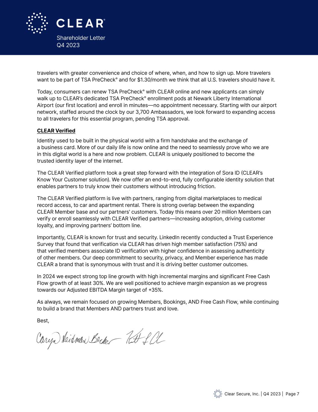 Clear Secure, Inc. | Q4 2023 | Page 7 Shareholder Letter Q4 2023 travelers with greater convenience and choice of where, when, and how to sign up. More travelers want to be part of TSA PreCheck® and for $1.30/month we think that all U.S. travelers should have it. Today, consumers can renew TSA PreCheck® with CLEAR online and new applicants can simply walk up to CLEAR’s dedicated TSA PreCheck® enrollment pods at Newark Liberty International Airport (our first location) and enroll in minutes—no appointment necessary. Starting with our airport network, staffed around the clock by our 3,700 Ambassadors, we look forward to expanding access to all travelers for this essential program, pending TSA approval. CLEAR Verified Identity used to be built in the physical world with a firm handshake and the exchange of a business card. More of our daily life is now online and the need to seamlessly prove who we are in this digital world is a here and now problem. CLEAR is uniquely positioned to become the trusted identity layer of the internet. The CLEAR Verified platform took a great step forward with the integration of Sora ID (CLEAR’s Know Your Customer solution). We now offer an end-to-end, fully configurable identity solution that enables partners to truly know their customers without introducing friction. The CLEAR Verified platform is live with partners, ranging from digital marketplaces to medical record access, to car and apartment rental. There is strong overlap between the expanding CLEAR Member base and our partners' customers. Today this means over 20 million Members can verify or enroll seamlessly with CLEAR Verified partners—increasing adoption, driving customer loyalty, and improving partners’ bottom line. Importantly, CLEAR is known for trust and security. LinkedIn recently conducted a Trust Experience Survey that found that verification via CLEAR has driven high member satisfaction (75%) and that verified members associate ID verification with higher confidence in assessing authenticity of other members. Our deep commitment to security, privacy, and Member experience has made CLEAR a brand that is synonymous with trust and it is driving better customer outcomes. In 2024 we expect strong top line growth with high incremental margins and significant Free Cash Flow growth of at least 30%. We are well positioned to achieve margin expansion as we progress towards our Adjusted EBITDA Margin target of +35%. As always, we remain focused on growing Members, Bookings, AND Free Cash Flow, while continuing to build a brand that Members AND partners trust and love. Best,