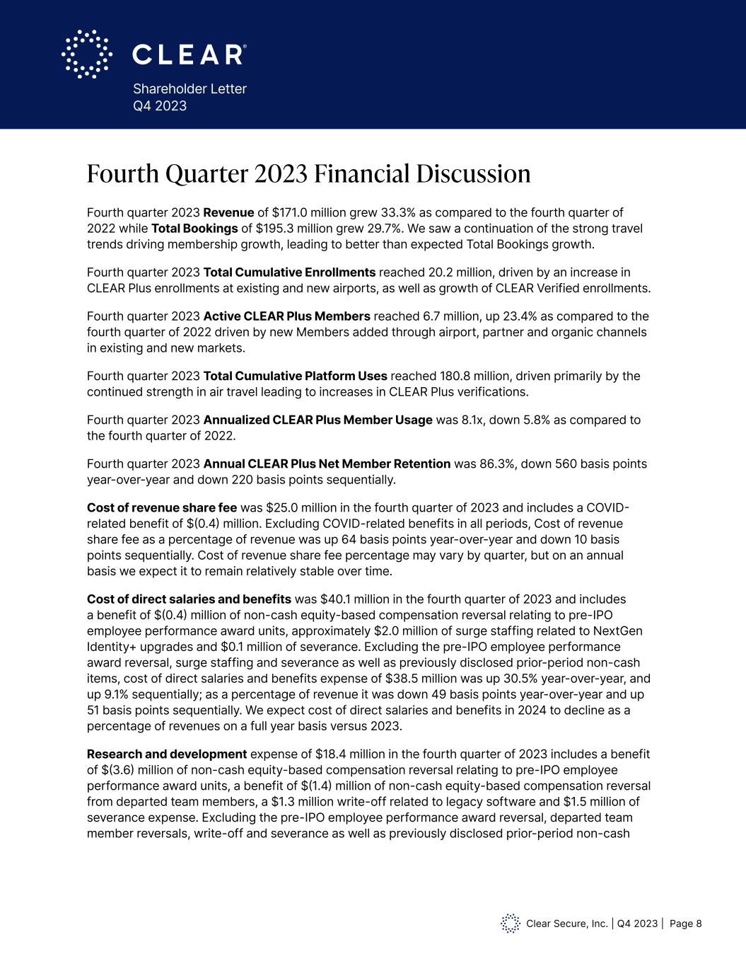 Clear Secure, Inc. | Q4 2023 | Page 8 Shareholder Letter Q4 2023 Fourth quarter 2023 Revenue of $171.0 million grew 33.3% as compared to the fourth quarter of 2022 while Total Bookings of $195.3 million grew 29.7%. We saw a continuation of the strong travel trends driving membership growth, leading to better than expected Total Bookings growth. Fourth quarter 2023 Total Cumulative Enrollments reached 20.2 million, driven by an increase in CLEAR Plus enrollments at existing and new airports, as well as growth of CLEAR Verified enrollments. Fourth quarter 2023 Active CLEAR Plus Members reached 6.7 million, up 23.4% as compared to the fourth quarter of 2022 driven by new Members added through airport, partner and organic channels in existing and new markets. Fourth quarter 2023 Total Cumulative Platform Uses reached 180.8 million, driven primarily by the continued strength in air travel leading to increases in CLEAR Plus verifications. Fourth quarter 2023 Annualized CLEAR Plus Member Usage was 8.1x, down 5.8% as compared to the fourth quarter of 2022. Fourth quarter 2023 Annual CLEAR Plus Net Member Retention was 86.3%, down 560 basis points year-over-year and down 220 basis points sequentially. Cost of revenue share fee was $25.0 million in the fourth quarter of 2023 and includes a COVID- related benefit of $(0.4) million. Excluding COVID-related benefits in all periods, Cost of revenue share fee as a percentage of revenue was up 64 basis points year-over-year and down 10 basis points sequentially. Cost of revenue share fee percentage may vary by quarter, but on an annual basis we expect it to remain relatively stable over time. Cost of direct salaries and benefits was $40.1 million in the fourth quarter of 2023 and includes a benefit of $(0.4) million of non-cash equity-based compensation reversal relating to pre-IPO employee performance award units, approximately $2.0 million of surge staffing related to NextGen Identity+ upgrades and $0.1 million of severance. Excluding the pre-IPO employee performance award reversal, surge staffing and severance as well as previously disclosed prior-period non-cash items, cost of direct salaries and benefits expense of $38.5 million was up 30.5% year-over-year, and up 9.1% sequentially; as a percentage of revenue it was down 49 basis points year-over-year and up 51 basis points sequentially. We expect cost of direct salaries and benefits in 2024 to decline as a percentage of revenues on a full year basis versus 2023. Research and development expense of $18.4 million in the fourth quarter of 2023 includes a benefit of $(3.6) million of non-cash equity-based compensation reversal relating to pre-IPO employee performance award units, a benefit of $(1.4) million of non-cash equity-based compensation reversal from departed team members, a $1.3 million write-off related to legacy software and $1.5 million of severance expense. Excluding the pre-IPO employee performance award reversal, departed team member reversals, write-off and severance as well as previously disclosed prior-period non-cash Fourth Quarter 2023 Financial Discussion