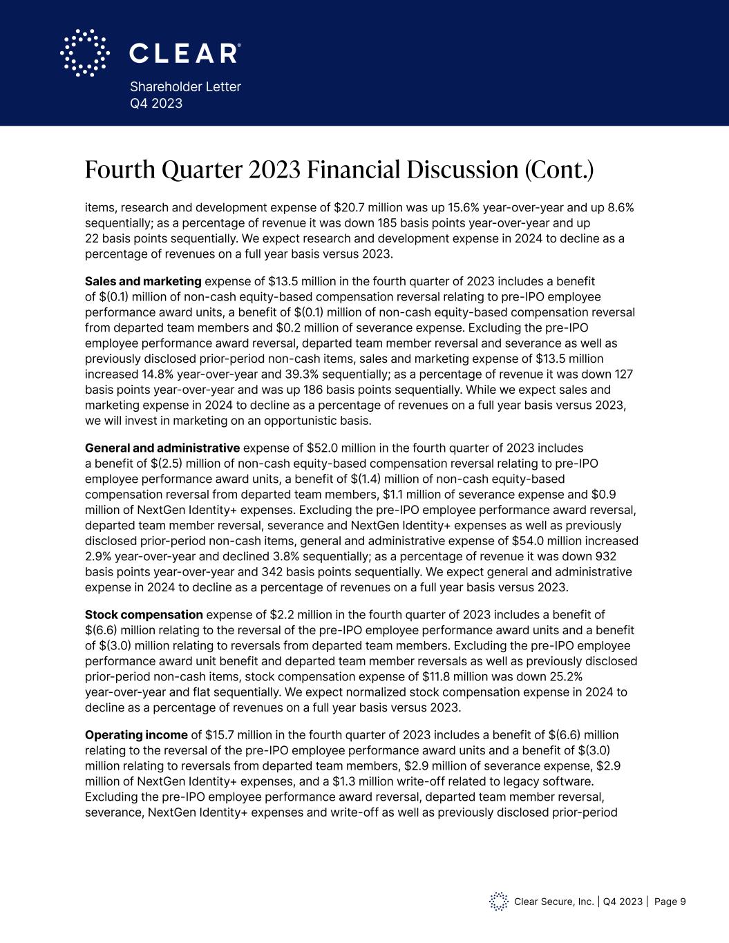 Clear Secure, Inc. | Q4 2023 | Page 9 Shareholder Letter Q4 2023 items, research and development expense of $20.7 million was up 15.6% year-over-year and up 8.6% sequentially; as a percentage of revenue it was down 185 basis points year-over-year and up 22 basis points sequentially. We expect research and development expense in 2024 to decline as a percentage of revenues on a full year basis versus 2023. Sales and marketing expense of $13.5 million in the fourth quarter of 2023 includes a benefit of $(0.1) million of non-cash equity-based compensation reversal relating to pre-IPO employee performance award units, a benefit of $(0.1) million of non-cash equity-based compensation reversal from departed team members and $0.2 million of severance expense. Excluding the pre-IPO employee performance award reversal, departed team member reversal and severance as well as previously disclosed prior-period non-cash items, sales and marketing expense of $13.5 million increased 14.8% year-over-year and 39.3% sequentially; as a percentage of revenue it was down 127 basis points year-over-year and was up 186 basis points sequentially. While we expect sales and marketing expense in 2024 to decline as a percentage of revenues on a full year basis versus 2023, we will invest in marketing on an opportunistic basis. General and administrative expense of $52.0 million in the fourth quarter of 2023 includes a benefit of $(2.5) million of non-cash equity-based compensation reversal relating to pre-IPO employee performance award units, a benefit of $(1.4) million of non-cash equity-based compensation reversal from departed team members, $1.1 million of severance expense and $0.9 million of NextGen Identity+ expenses. Excluding the pre-IPO employee performance award reversal, departed team member reversal, severance and NextGen Identity+ expenses as well as previously disclosed prior-period non-cash items, general and administrative expense of $54.0 million increased 2.9% year-over-year and declined 3.8% sequentially; as a percentage of revenue it was down 932 basis points year-over-year and 342 basis points sequentially. We expect general and administrative expense in 2024 to decline as a percentage of revenues on a full year basis versus 2023. Stock compensation expense of $2.2 million in the fourth quarter of 2023 includes a benefit of $(6.6) million relating to the reversal of the pre-IPO employee performance award units and a benefit of $(3.0) million relating to reversals from departed team members. Excluding the pre-IPO employee performance award unit benefit and departed team member reversals as well as previously disclosed prior-period non-cash items, stock compensation expense of $11.8 million was down 25.2% year-over-year and flat sequentially. We expect normalized stock compensation expense in 2024 to decline as a percentage of revenues on a full year basis versus 2023. Operating income of $15.7 million in the fourth quarter of 2023 includes a benefit of $(6.6) million relating to the reversal of the pre-IPO employee performance award units and a benefit of $(3.0) million relating to reversals from departed team members, $2.9 million of severance expense, $2.9 million of NextGen Identity+ expenses, and a $1.3 million write-off related to legacy software. Excluding the pre-IPO employee performance award reversal, departed team member reversal, severance, NextGen Identity+ expenses and write-off as well as previously disclosed prior-period Fourth Quarter 2023 Financial Discussion (Cont.)