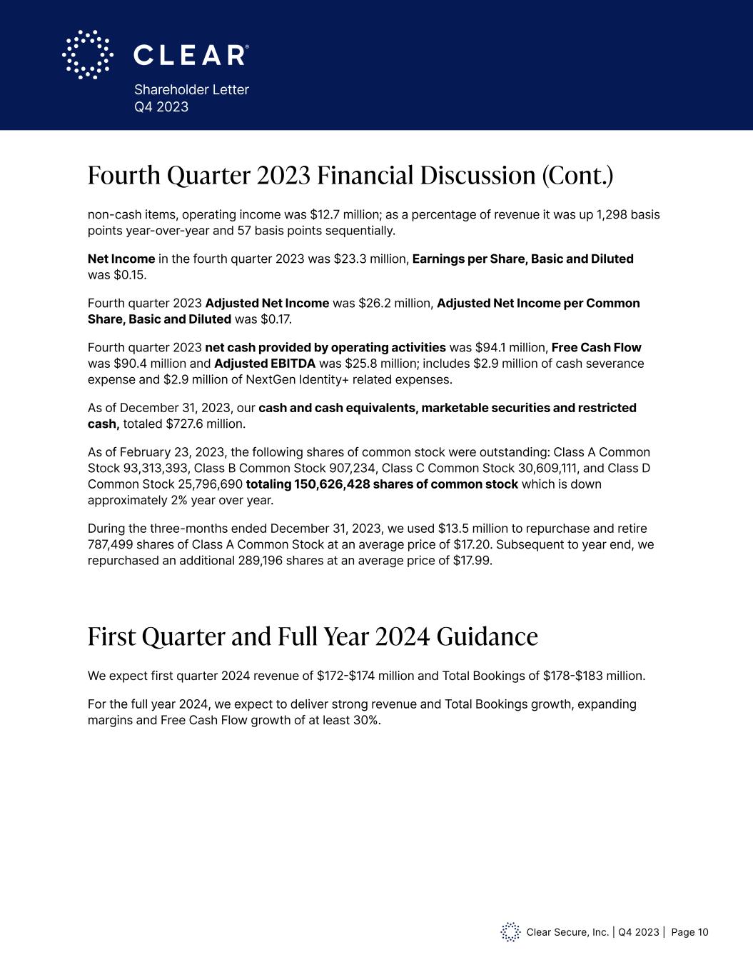Clear Secure, Inc. | Q4 2023 | Page 10 Shareholder Letter Q4 2023 non-cash items, operating income was $12.7 million; as a percentage of revenue it was up 1,298 basis points year-over-year and 57 basis points sequentially. Net Income in the fourth quarter 2023 was $23.3 million, Earnings per Share, Basic and Diluted was $0.15. Fourth quarter 2023 Adjusted Net Income was $26.2 million, Adjusted Net Income per Common Share, Basic and Diluted was $0.17. Fourth quarter 2023 net cash provided by operating activities was $94.1 million, Free Cash Flow was $90.4 million and Adjusted EBITDA was $25.8 million; includes $2.9 million of cash severance expense and $2.9 million of NextGen Identity+ related expenses. As of December 31, 2023, our cash and cash equivalents, marketable securities and restricted cash, totaled $727.6 million. As of February 23, 2023, the following shares of common stock were outstanding: Class A Common Stock 93,313,393, Class B Common Stock 907,234, Class C Common Stock 30,609,111, and Class D Common Stock 25,796,690 totaling 150,626,428 shares of common stock which is down approximately 2% year over year. During the three-months ended December 31, 2023, we used $13.5 million to repurchase and retire 787,499 shares of Class A Common Stock at an average price of $17.20. Subsequent to year end, we repurchased an additional 289,196 shares at an average price of $17.99. Fourth Quarter 2023 Financial Discussion (Cont.) First Quarter and Full Year 2024 Guidance We expect first quarter 2024 revenue of $172-$174 million and Total Bookings of $178-$183 million. For the full year 2024, we expect to deliver strong revenue and Total Bookings growth, expanding margins and Free Cash Flow growth of at least 30%.