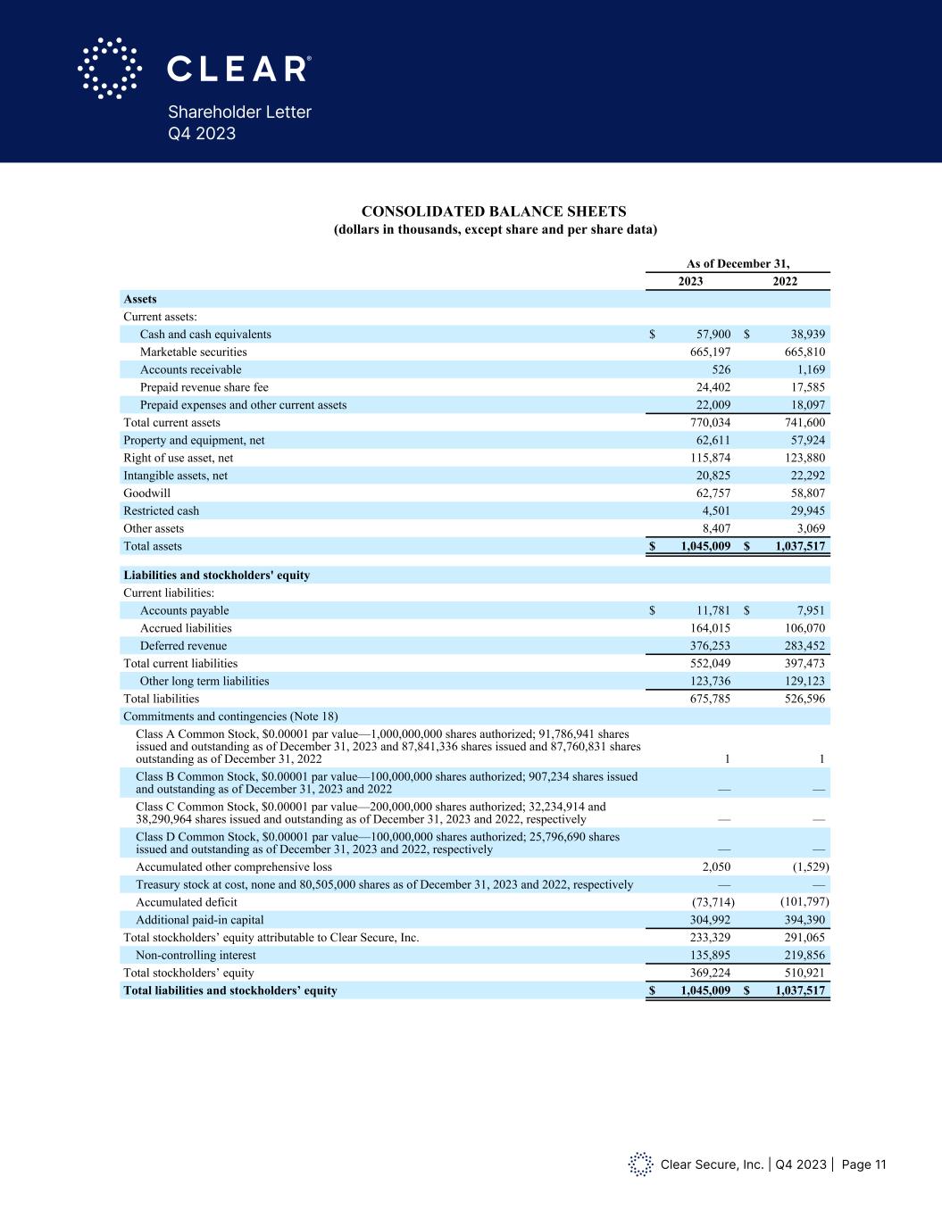 Clear Secure, Inc. | Q4 2023 | Page 11 Shareholder Letter Q4 2023 CLEAR SECURE, INC. CONSOLIDATED BALANCE SHEETS (dollars in thousands, except share and per share data) As of December 31, 2023 2022 Assets Current assets: Cash and cash equivalents $ 57,900 $ 38,939 Marketable securities 665,197 665,810 Accounts receivable 526 1,169 Prepaid revenue share fee 24,402 17,585 Prepaid expenses and other current assets 22,009 18,097 Total current assets 770,034 741,600 Property and equipment, net 62,611 57,924 Right of use asset, net 115,874 123,880 Intangible assets, net 20,825 22,292 Goodwill 62,757 58,807 Restricted cash 4,501 29,945 Other assets 8,407 3,069 Total assets $ 1,045,009 $ 1,037,517 Liabilities and stockholders' equity Current liabilities: Accounts payable $ 11,781 $ 7,951 Accrued liabilities 164,015 106,070 Deferred revenue 376,253 283,452 Total current liabilities 552,049 397,473 Other long term liabilities 123,736 129,123 Total liabilities 675,785 526,596 Commitments and contingencies (Note 18) Class A Common Stock, $0.00001 par value—1,000,000,000 shares authorized; 91,786,941 shares issued and outstanding as of December 31, 2023 and 87,841,336 shares issued and 87,760,831 shares outstanding as of December 31, 2022 1 1 Class B Common Stock, $0.00001 par value—100,000,000 shares authorized; 907,234 shares issued and outstanding as of December 31, 2023 and 2022 — — Class C Common Stock, $0.00001 par value—200,000,000 shares authorized; 32,234,914 and 38,290,964 shares issued and outstanding as of December 31, 2023 and 2022, respectively — — Class D Common Stock, $0.00001 par value—100,000,000 shares authorized; 25,796,690 shares issued and outstanding as of December 31, 2023 and 2022, respectively — — Accumulated other comprehensive loss 2,050 (1,529) Treasury stock at cost, none and 80,505,000 shares as of December 31, 2023 and 2022, respectively — — Accumulated deficit (73,714) (101,797) Additional paid-in capital 304,992 394,390 Total stockholders’ equity attributable to Clear Secure, Inc. 233,329 291,065 Non-controlling interest 135,895 219,856 Total stockholders’ equity 369,224 510,921 Total liabilities and stockholders’ equity $ 1,045,009 $ 1,037,517