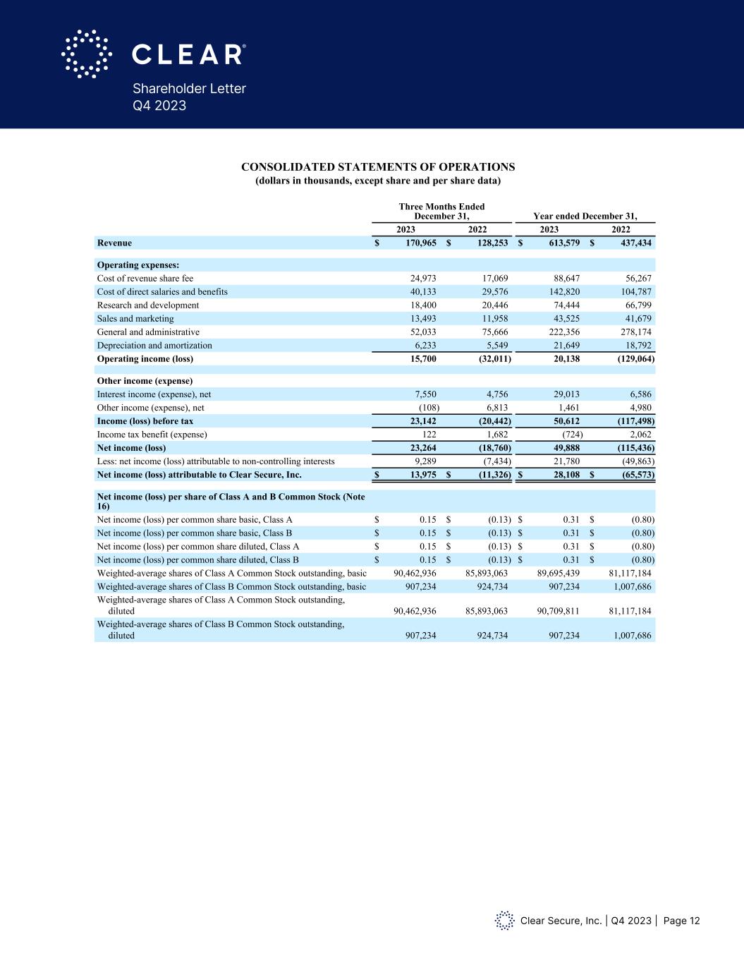 Clear Secure, Inc. | Q4 2023 | Page 12 Shareholder Letter Q4 2023 CLEAR SECURE, INC. CONSOLIDATED STATEMENTS OF OPERATIONS (dollars in thousands, except share and per share data) Revenue $ 170,965 $ 128,253 $ 613,579 $ 437,434 Operating expenses: Cost of revenue share fee 24,973 17,069 88,647 56,267 Cost of direct salaries and benefits 40,133 29,576 142,820 104,787 Research and development 18,400 20,446 74,444 66,799 Sales and marketing 13,493 11,958 43,525 41,679 General and administrative 52,033 75,666 222,356 278,174 Depreciation and amortization 6,233 5,549 21,649 18,792 Operating income (loss) 15,700 (32,011) 20,138 (129,064) Other income (expense) Interest income (expense), net 7,550 4,756 29,013 6,586 Other income (expense), net (108) 6,813 1,461 4,980 Income (loss) before tax 23,142 (20,442) 50,612 (117,498) Income tax benefit (expense) 122 1,682 (724) 2,062 Net income (loss) 23,264 (18,760) 49,888 (115,436) Less: net income (loss) attributable to non-controlling interests 9,289 (7,434) 21,780 (49,863) Net income (loss) attributable to Clear Secure, Inc. $ 13,975 $ (11,326) $ 28,108 $ (65,573) Net income (loss) per share of Class A and B Common Stock (Note 16) Net income (loss) per common share basic, Class A $ 0.15 $ (0.13) $ 0.31 $ (0.80) Net income (loss) per common share basic, Class B $ 0.15 $ (0.13) $ 0.31 $ (0.80) Net income (loss) per common share diluted, Class A $ 0.15 $ (0.13) $ 0.31 $ (0.80) Net income (loss) per common share diluted, Class B $ 0.15 $ (0.13) $ 0.31 $ (0.80) Weighted-average shares of Class A Common Stock outstanding, basic 90,462,936 85,893,063 89,695,439 81,117,184 Weighted-average shares of Class B Common Stock outstanding, basic 907,234 924,734 907,234 1,007,686 Weighted-average shares of Class A Common Stock outstanding, diluted 90,462,936 85,893,063 90,709,811 81,117,184 Weighted-average shares of Class B Common Stock outstanding, diluted 907,234 924,734 907,234 1,007,686 Three Months Ended December 31, Year ended December 31, 2023 2022 2023 2022