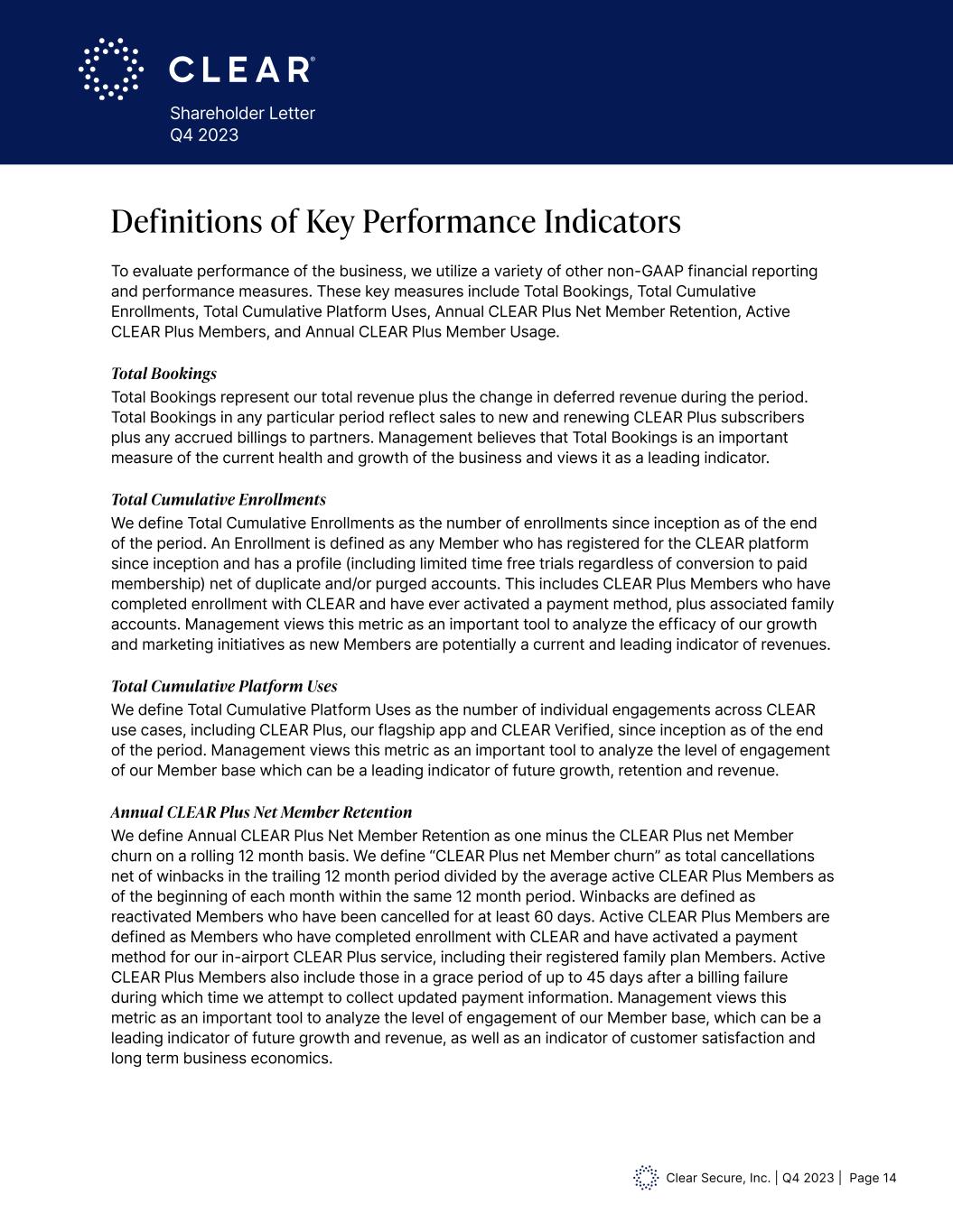 Clear Secure, Inc. | Q4 2023 | Page 14 Shareholder Letter Q4 2023 To evaluate performance of the business, we utilize a variety of other non-GAAP financial reporting and performance measures. These key measures include Total Bookings, Total Cumulative Enrollments, Total Cumulative Platform Uses, Annual CLEAR Plus Net Member Retention, Active CLEAR Plus Members, and Annual CLEAR Plus Member Usage. Total Bookings Total Bookings represent our total revenue plus the change in deferred revenue during the period. Total Bookings in any particular period reflect sales to new and renewing CLEAR Plus subscribers plus any accrued billings to partners. Management believes that Total Bookings is an important measure of the current health and growth of the business and views it as a leading indicator. Total Cumulative Enrollments We define Total Cumulative Enrollments as the number of enrollments since inception as of the end of the period. An Enrollment is defined as any Member who has registered for the CLEAR platform since inception and has a profile (including limited time free trials regardless of conversion to paid membership) net of duplicate and/or purged accounts. This includes CLEAR Plus Members who have completed enrollment with CLEAR and have ever activated a payment method, plus associated family accounts. Management views this metric as an important tool to analyze the efficacy of our growth and marketing initiatives as new Members are potentially a current and leading indicator of revenues. Total Cumulative Platform Uses We define Total Cumulative Platform Uses as the number of individual engagements across CLEAR use cases, including CLEAR Plus, our flagship app and CLEAR Verified, since inception as of the end of the period. Management views this metric as an important tool to analyze the level of engagement of our Member base which can be a leading indicator of future growth, retention and revenue. Annual CLEAR Plus Net Member Retention We define Annual CLEAR Plus Net Member Retention as one minus the CLEAR Plus net Member churn on a rolling 12 month basis. We define “CLEAR Plus net Member churn” as total cancellations net of winbacks in the trailing 12 month period divided by the average active CLEAR Plus Members as of the beginning of each month within the same 12 month period. Winbacks are defined as reactivated Members who have been cancelled for at least 60 days. Active CLEAR Plus Members are defined as Members who have completed enrollment with CLEAR and have activated a payment method for our in-airport CLEAR Plus service, including their registered family plan Members. Active CLEAR Plus Members also include those in a grace period of up to 45 days after a billing failure during which time we attempt to collect updated payment information. Management views this metric as an important tool to analyze the level of engagement of our Member base, which can be a leading indicator of future growth and revenue, as well as an indicator of customer satisfaction and long term business economics. Definitions of Key Performance Indicators