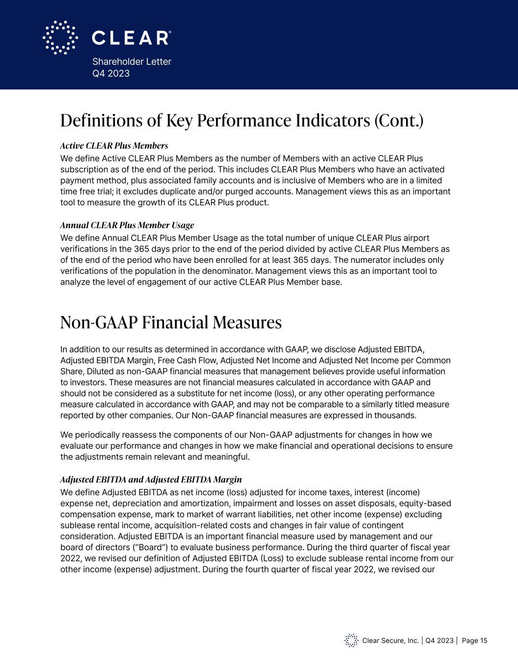 Clear Secure, Inc. | Q4 2023 | Page 15 Shareholder Letter Q4 2023 In addition to our results as determined in accordance with GAAP, we disclose Adjusted EBITDA, Adjusted EBITDA Margin, Free Cash Flow, Adjusted Net Income and Adjusted Net Income per Common Share, Diluted as non-GAAP financial measures that management believes provide useful information to investors. These measures are not financial measures calculated in accordance with GAAP and should not be considered as a substitute for net income (loss), or any other operating performance measure calculated in accordance with GAAP, and may not be comparable to a similarly titled measure reported by other companies. Our Non-GAAP financial measures are expressed in thousands. We periodically reassess the components of our Non-GAAP adjustments for changes in how we evaluate our performance and changes in how we make financial and operational decisions to ensure the adjustments remain relevant and meaningful. Adjusted EBITDA and Adjusted EBITDA Margin We define Adjusted EBITDA as net income (loss) adjusted for income taxes, interest (income) expense net, depreciation and amortization, impairment and losses on asset disposals, equity-based compensation expense, mark to market of warrant liabilities, net other income (expense) excluding sublease rental income, acquisition-related costs and changes in fair value of contingent consideration. Adjusted EBITDA is an important financial measure used by management and our board of directors (“Board”) to evaluate business performance. During the third quarter of fiscal year 2022, we revised our definition of Adjusted EBITDA (Loss) to exclude sublease rental income from our other income (expense) adjustment. During the fourth quarter of fiscal year 2022, we revised our Non-GAAP Financial Measures Active CLEAR Plus Members We define Active CLEAR Plus Members as the number of Members with an active CLEAR Plus subscription as of the end of the period. This includes CLEAR Plus Members who have an activated payment method, plus associated family accounts and is inclusive of Members who are in a limited time free trial; it excludes duplicate and/or purged accounts. Management views this as an important tool to measure the growth of its CLEAR Plus product. Annual CLEAR Plus Member Usage We define Annual CLEAR Plus Member Usage as the total number of unique CLEAR Plus airport verifications in the 365 days prior to the end of the period divided by active CLEAR Plus Members as of the end of the period who have been enrolled for at least 365 days. The numerator includes only verifications of the population in the denominator. Management views this as an important tool to analyze the level of engagement of our active CLEAR Plus Member base. Definitions of Key Performance Indicators (Cont.)