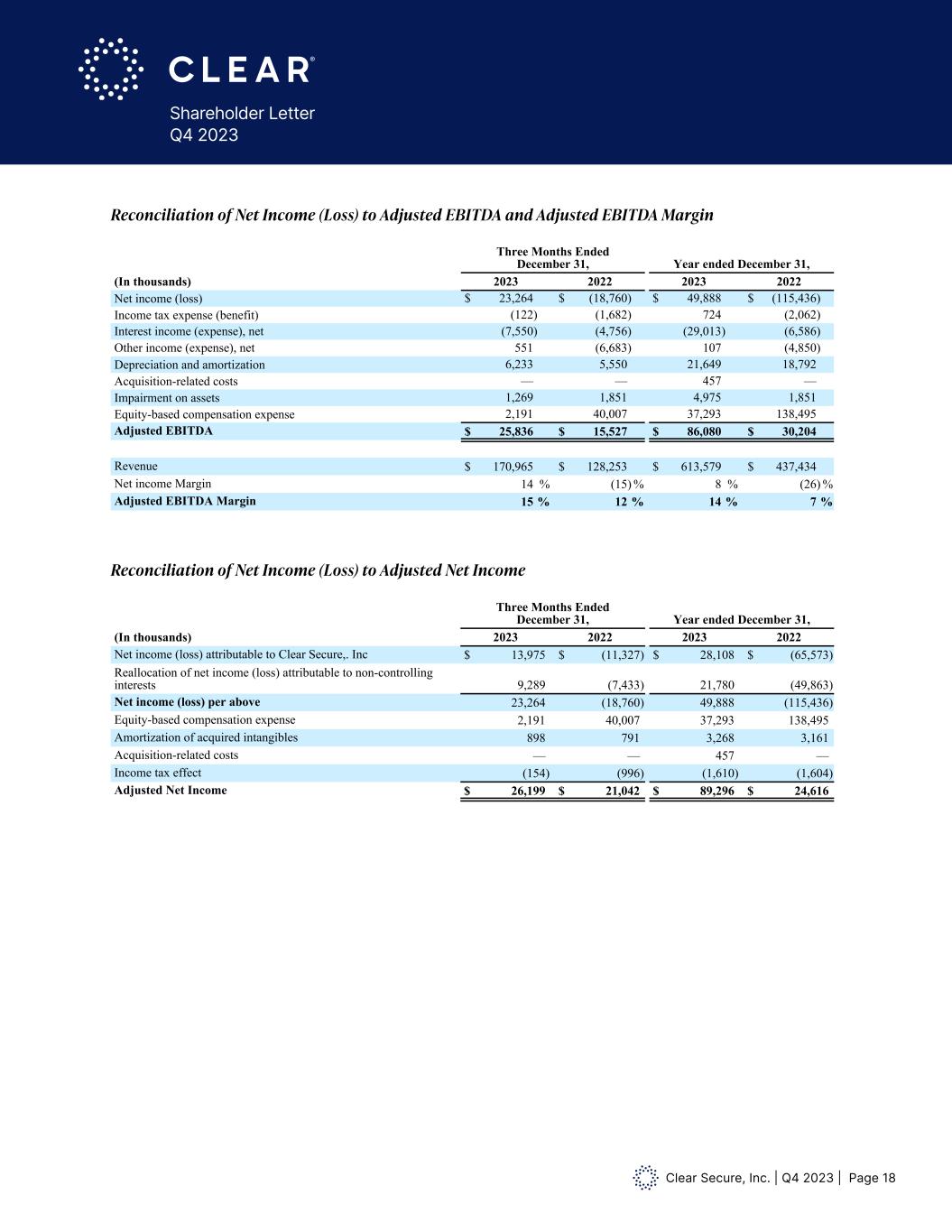 Clear Secure, Inc. | Q4 2023 | Page 18 Shareholder Letter Q4 2023 Forward Looking Statements This release may contain statements that constitute forward-looking statements within the meaning of the Private Securities Litigation Reform Act of 1995. Investors are cautioned that any and such forward looking statement are not guarantees of future performance or results and involve risks and uncertainties, and that actual results, developments and events may differ materially from those in the forward-looking statements as a result of various factors, including those described in the Company’s filings with the Securities and Exchange Commission, including the sections titled “Risk Factors” in our Annual Report on Form 10-K for the year ended December 31, 2023. The Company disclaims any obligation to update any forward looking statements contained herein. Reconciliation of Net Income (Loss) to Adjusted EBITDA and Adjusted EBITDA Margin Three Months Ended December 31, Year ended December 31, (In thousands) 2023 2022 2023 2022 Net income (loss) $ 23,264 $ (18,760) $ 49,888 $ (115,436) Income tax expense (benefit) (122) (1,682) 724 (2,062) Interest income (expense), net (7,550) (4,756) (29,013) (6,586) Other income (expense), net 551 (6,683) 107 (4,850) Depreciation and amortization 6,233 5,550 21,649 18,792 Acquisition-related costs — — 457 — Impairment on assets 1,269 1,851 4,975 1,851 Equity-based compensation expense 2,191 40,007 37,293 138,495 Adjusted EBITDA $ 25,836 $ 15,527 $ 86,080 $ 30,204 Revenue $ 170,965 $ 128,253 $ 613,579 $ 437,434 Net income Margin 14 % (15) % 8 % (26) % Adjusted EBITDA Margin 15 % 12 % 14 % 7 % Reconciliation of Net Income (Loss) to Adjusted Net Income Three Months Ended December 31, Year ended December 31, (In thousands) 2023 2022 2023 2022 Net income (loss) attributable to Clear Secure,. Inc $ 13,975 $ (11,327) $ 28,108 $ (65,573) Reallocation of net income (loss) attributable to non-controlling interests 9,289 (7,433) 21,780 (49,863) Net income (loss) per above 23,264 (18,760) 49,888 (115,436) Equity-based compensation expense 2,191 40,007 37,293 138,495 Amortization of acquired intangibles 898 791 3,268 3,161 Acquisition-related costs — — 457 — Income tax effect (154) (996) (1,610) (1,604) Adjusted Net Income $ 26,199 $ 21,042 $ 89,296 $ 24,616 Forward Looking Statements This rel ase may contain statements that constitute forw rd-looking statements within the mea ing of the Private Securities Litigation Reform Act f 1995. Inv stors are ca tioned that any and such forward looking statement are not guarantees of future p rformance or results and involve risks and uncertainties, and that actual result , developments and events may differ materially from those in th forward-looking statements as a result of various factors, including th se described in the Company’s filings with the Securities and Exchange Commission, including the sections titled “Risk Factors” in our Annual Report on Form 10-K for the year ended December 31, 2023. The Company disclaims any obligation to update any forward looking statements contained herein. Reconciliation of Net Income (Loss) to Adjusted EBITDA and Adjusted EBITDA Margin Three Months Ended December 31, Year ended December 31, (In thousands) 2023 2022 2023 2022 Net income (loss) $ 23,264 $ (18,760) $ 49,888 $ (115,436) Income tax exp ns (benefi ) (122) (1,682) 724 (2,062) Inte st income (expense), net (7,550) (4,756) (29,013) (6,586) Other inc me (expense), net 551 (6,683) 107 (4,850) De reciation and amortization 6, 33 5,550 21,649 18,792 Acquisition-related costs — — 457 — Impairment on assets 1,269 1,851 4,975 1,851 Equity-based compensation expense 2,191 40,007 37,293 138,495 Adjusted EBITDA 25,836 15,527 $ 86,080 $ 30,204 Revenue $ 170,96 $ 128,253 $ 613,579 $ 437,434 Net income Margin 14 % (15) % 8 % (26) % Adjusted EBITDA Margin 15 % 12 % 14 % 7 % Reconciliation of Net Income (Loss) to Adjusted Net Income Three Months Ended December 31, Year ended December 31, (In thousa ds) 2023 2022 2023 2022 Net income (loss) attributable to Clear Secure,. Inc $ 13,975 $ (11,327) $ 28,108 $ (65,573) Reallocation of net income (loss) attributable to non-controlling interests 9,289 (7,433) 21,780 (49,863) Net income (l ss) per above 23,264 (18,760) 49,888 (115,436) Equity-based compensation expense 2,191 40,007 37,293 138,495 Amortization of acquired intangibles 898 791 3,268 3,161 cq isition-related costs — — 457 — Income tax effect (154) (996) (1,610) (1,604) Adjusted Net Income $ 26,199 $ 21,042 $ 89,296 $ 24,616 conc liati n of Net Income (Loss) to Adjusted EBITDA and Adjusted EBITDA Margin Reconciliation of Net Income (Loss) to Adjusted Net Income