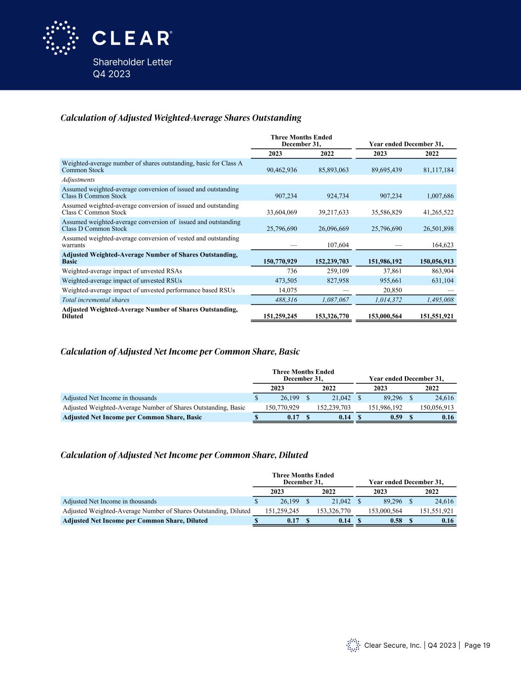 Clear Secure, Inc. | Q4 2023 | Page 19 Shareholder Letter Q4 2023 Calculation of Adjusted Weighted-Average Shares Outstanding Calculation of Adjusted Weighted-Average Shares Outstanding Weighted-average number of shares outstanding, basic for Class A Common Stock 90,462,936 85,893,063 89,695,439 81,117,184 Adjustments Assumed weighted-average conversion of issued and outstanding Class B Common Stock 907,234 924,734 907,234 1,007,686 Assumed weighted-average conversion of issued and outstanding Class C Common Stock 33,604,069 39,217,633 35,586,829 41,265,522 Assumed weighted-average conversion of issued and outstanding Class D Common Stock 25,796,690 26,096,669 25,796,690 26,501,898 Assumed weighted-average conversion of vested and outstanding warrants — 107,604 — 164,623 Adjusted Weighted-Average Number of Shares Outstanding, Basic 150,770,929 152,239,703 151,986,192 150,056,913 Weighted-average impact of unvested RSAs 736 259,109 37,861 863,904 Weighted-average impact of unvested RSUs 473,505 827,958 955,661 631,104 Weighted-average impact of unvested performance based RSUs 14,075 — 20,850 — Total incremental shares 488,316 1,087,067 1,014,372 1,495,008 Adjusted Weighted-Average Number of Shares Outstanding, Diluted 151,259,245 153,326,770 153,000,564 151,551,921 Three Months Ended December 31, Year ended December 31, 2023 2022 2023 2022 Calculation of Adjusted Net Income per Common Share, Basic Three Months Ended December 31, Year ended December 31, 2023 2022 2023 2022 Adjusted Net Income in thousands $ 26,199 $ 21,042 $ 89,296 $ 24,616 Adjusted Weighted-Average Number of Shares Outstanding, Basic 150,770,929 152,239,703 151,986,192 150,056,913 Adjusted Net Income per Common Share, Basic $ 0.17 $ 0.14 $ 0.59 $ 0.16 Calculation of Adjusted Net Income per Common Share, Diluted Three Months Ended December 31, Year ended December 31, 2023 2022 2023 2022 Adjusted Net Income in thousands $ 26,199 $ 21,042 $ 89,296 $ 24,616 Adjusted Weighted-Average Number of Shares Outstanding, Diluted 151,259,245 153,326,770 153,000,564 151,551,921 Adjusted Net Income per Common Share, Diluted $ 0.17 $ 0.14 $ 0.58 $ 0.16 Summary of Adjusted Net Income per Common Share: Three Months Ended December 31, Year ended December 31, 2023 2022 2023 2022 Adjusted Net Income per Common Share, Basic $ 0.17 $ 0.14 $ 0.59 $ 0.16 Adjusted Net Income per Common Share, Diluted $ 0.17 $ 0.14 $ 0.58 $ 0.16 Reconciliation of Net cash provided by (used in) operating activities to Free Cash Flow Three Months Ended December 31, Year ended December 31, (In thousands) 2023 2022 2023 2022 Net cash provided by operating activities $ 94,131 $ 79,280 $ 225,033 $ 168,310 Purchases of property and equipment (3,730) (8,289) (25,555) (31,362) Free Cash Flow $ 90,401 $ 70,991 $ 199,478 $ 136,948 Calculation of Adjusted Weighted-Average Shares Outstanding Weighted-average number of shares outstanding, basic for Class A Common Stock 90,462,936 85,893,063 89,695,439 81,117,184 Adjustments Assumed weighted-average conversion of issued and outstanding Class B Common Stock 907,234 924,734 907,234 1,007,686 Assumed weighted-average conversion of issued and outstanding Class C Common Stock 33,604,069 39,217,633 35,586,829 41,265,522 Assumed weighted-average conversion of issued and outstanding Class D Common Stock 25,796,690 26,096,669 25,796,690 26,501,898 Assumed weighted-average conversion of vested and outstanding warrants — 107,604 — 164,623 Adjusted Weighted-Average Number of Shares Outstanding, Basic 150,770,929 152,239,703 151,986,192 150,056,913 Weighted-average impact of unvested RSAs 736 259,109 37,861 863,904 Weighted-average impact of unvested RSUs 473,505 827,958 955,661 631,104 Weighted-average impact of unvested performance based RSUs 14,075 — 20,850 — Total incremental shares 488,316 1,087,067 1,014,372 1,495,008 Adjusted Weighted-Average Number of Shares Outstanding, Diluted 151,259,245 153,326,770 153,000,564 151,551,921 Three Months Ended December 31, Year ended December 31, 2023 2022 2023 2022 Calculation of Adjusted Net Income per Common Share, Basic Three Months Ended December 31, Year ended December 31, 2023 2022 2023 2022 Adjusted Net Income in thousands $ 26,199 $ 21,042 $ 89,296 $ 24,616 Adjusted Weighted-Average Number of Shares Outstanding, Basic 150,770,929 152,239,703 151,986,192 150,056,913 Adjusted Net Income per Common Share, Basic $ 0.17 $ 0.14 $ 0.59 $ 0.16 Calculation of Adjusted Net Income per Common Share, Diluted Three Months Ended December 31, Year ended December 31, 2023 2022 2023 2022 Adjusted Net Income in thousands $ 26,199 $ 21,042 $ 89,296 $ 24,616 Adjusted Weighted-Average Number of Shares Outstanding, Diluted 151,259,245 153,326,770 153,000,564 151,551,921 Adjusted Net Income per Common Share, Diluted $ 0.17 $ 0.14 $ 0.58 $ 0.16 Summary of Adjusted Net Income per Common Share: Three Months Ended December 31, Year ended December 31, 2023 2022 2023 2022 Adjusted Net Income per Common Share, Basic $ 0.17 $ 0.14 $ 0.59 $ 0.16 Adjusted Net Income per Common Share, Diluted $ 0.17 $ 0.14 $ 0.58 $ 0.16 Reconciliation of Net cash provided by (used in) operating activities to Free Cash Flow Three Months Ended December 31, Year ended December 31, (In thousands) 2023 2022 2023 2022 Net cash provided by operating activities $ 94,131 $ 79,280 $ 225,033 $ 168,310 Purchases of property and equipment (3,730) (8,289) (25,555) (31,362) Free Cash Flow $ 90,401 $ 70,991 $ 199,478 $ 136,948 Calculation of Adjusted Weighted-Average Shares Outstanding Weighte -average number of share utstanding, basic for Class A ommon Stock 90,462 9 6 85,893 063 89,695 4 9 8 11 1 4 dj stments ss i te -a erage conversion of issue a d outstanding Class B Common Stock 907,234 924,734 907,234 1,007,686 ss m weighted-average conversion f issued and outstanding Class C Common Stock 33,604,069 39,217,633 35,586,8 9 41,2 5,522 Assum weight d-average conversion of issued and outstanding Class D Common Stock 25,796,690 26,096,669 25,7