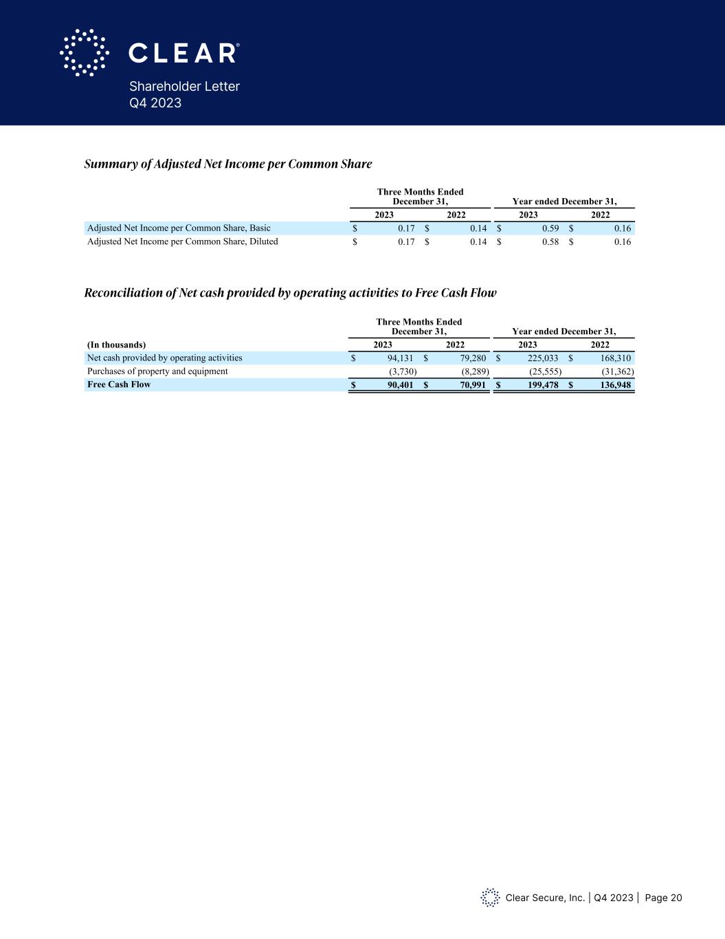 Clear Secure, Inc. | Q4 2023 | Page 20 Shareholder Letter Q4 2023 Reconciliation of Net cash provided by operating activities to Free Cash Flow Calculation of Adjusted Weighted-Average Shares Outstanding Weighted-average number of shares outstanding, basic for Class A Common Stock 90,462,936 85,893,063 89,695,439 81,117,184 Adjustments Assumed weighted-average conversion of issued and outstanding Class B Common Stock 907,234 924,734 907,234 1,007,686 Assumed weighted-average conversion of issued and outstanding Class C Common Stock 33,604,069 39,217,633 35,586,829 41,265,522 Assumed weighted-average conversion of issued and outstanding Class D Common Stock 25,796,690 26,096,669 25,796,690 26,501,898 Assumed weighted-average conversion of vested and outstanding warrants — 107,604 — 164,623 Adjusted Weighted-Average Number of Shares Outstanding, Basic 150,770,929 152,239,703 151,986,192 150,056,913 Weighted-average impact of unvested RSAs 736 259,109 37,861 863,904 Weighted-average impact of unvested RSUs 473,505 827,958 955,661 631,104 Weighted-average impact of unvested performance based RSUs 14,075 — 20,850 — Total incremental shares 488,316 1,087,067 1,014,372 1,495,008 Adjusted Weighted-Average Number of Shares Outstanding, Diluted 151,259,245 153,326,770 153,000,564 151,551,921 Three Months Ended December 31, Year ended December 31, 2023 2022 2023 2022 Calculation of Adjusted Net Income per Common Share, Basic Three Months Ended December 31, Year ended December 31, 2023 2022 2023 2022 Adjusted Net Income in thousands $ 26,199 $ 21,042 $ 89,296 $ 24,616 Adjusted Weighted-Average Number of Shares Outstanding, Basic 150,770,929 152,239,703 151,986,192 150,056,913 Adjusted Net Income per Common Share, Basic $ 0.17 $ 0.14 $ 0.59 $ 0.16 Calculation of Adjusted Net Income per Common Share, Diluted Three Months Ended December 31, Year ended December 31, 2023 2022 2023 2022 Adjusted Net Income in thousands $ 26,199 $ 21,042 $ 89,296 $ 24,616 Adjusted Weighted-Average Number of Shares Outstanding, Diluted 151,259,245 153,326,770 153,000,564 151,551,921 Adjusted Net Income per Common Share, Diluted $ 0.17 $ 0.14 $ 0.58 $ 0.16 Summary of Adjusted Net Income per Common Share: Three Months Ended December 31, Year ended December 31, 2023 2022 2023 2022 Adjusted Net Income per Common Share, Basic $ 0.17 $ 0.14 $ 0.59 $ 0.16 Adjusted Net Income per Common Share, Diluted $ 0.17 $ 0.14 $ 0.58 $ 0.16 econciliation of Net cash provided by (used in) operating activities to Free Cash Flow Three Months Ended December 31, Year ended December 31, (In thousands) 2023 2022 2023 2022 Net cash provided by operating activities $ 94,131 $ 79,280 $ 225,033 $ 168,310 Purchases of property and equipment (3,730) (8,289) (25,555) (31,362) Free Cash Flow $ 90,401 $ 70,991 $ 199,478 $ 136,948 Calculation of Adjusted Weighted-Average Shares Outstanding Weighted-average number of shares outstanding, basic for Class A Common Stock 90,462,936 85,893,063 89,695,439 81,117,184 Adjustments Assumed weighted-average conversion of issued and outstanding Class B Common Stock 907,234 924,734 907,234 1,007,686 Assumed weighted-average conversion of issued and outstanding Class C Common Stock 33,604,069 39,217,633 35,586,829 41,265,522 Assumed weighted-average conversion of issued and outstanding Class D Common Stock 25,796,690 26,096,669 25,796,690 26,501,898 Assumed weighted-average conversion of vested and outstanding warrants — 107,604 — 164,623 Adjusted Weighted-Average Number of Shares Outstanding, Basic 150,770,929 152,239,703 151,986,192 150,056,913 Weighted-average impact of unvested RSAs 736 259,109 37,861 863,904 Weighted-average impact of unvested RSUs 473,505 827,958 955,661 631,104 Weighted-average impact of unvested performance based RSUs 14,075 — 20,850 — Total incremental shares 488,316 1,087,067 1,014,372 1,495,008 Adjusted Weighted-Average Number of Shares Outstanding, Diluted 151,259,245 153,326,770 153,000,564 151,551,921 Three Months Ended December 31, Year ended December 31, 2023 2022 2023 2022 Calculation of Adjusted Net Income per Common Share, Basic Three Months Ended December 31, Year ended December 31, 2023 2022 2023 2022 Adjusted Net Income in thousands $ 26,199 $ 21,042 $ 89,296 $ 24,616 Adjusted Weighted-Average Number of Shares Outstanding, Basic 150,770,929 152,239,703 151,986,192 150,056,913 djusted Net Income per Common Share, Basic $ 0.17 $ 0.14 $ 0.59 $ 0.16 Calc lation of Adjusted Net Income p r Common Share, Diluted Three Months Ended December 31, Year ended December 31, 2023 2022 2023 2022 Adjusted Net Income in thousands $ 26,199 $ 21,042 $ 89,296 $ 24,616 Adjusted Weighted-Average Number of Shares Outstanding, Diluted 151,259,245 153,326,770 153,000,564 151,551,921 j sted Net Income per Common Share, Diluted $ 0.17 $ 0.14 $ 0.58 $ 0.16 Summary of Adjusted Net Income per Common Share: Three Months Ended December 31, Year ended December 31, 2023 2022 2023 2022 Adjusted Net Income per Common Share, Basic $ 0.17 $ 0.14 $ 0.59 $ 0.16 Adjusted Net Income per Common Share, Diluted $ 0.17 $ 0.14 $ 0.58 $ 0.16 Reconciliatio f Net cash pr vided by (us in) operating activities to Free Cash Flow Three Months Ended December 31, Year ended December 31, (In thousands) 2023 2022 2023 2022 Net cash provided by operating activities $ 94,131 $ 79,280 $ 225,033 $ 168,310 Purc ases of property and equipment (3,730) (8,289) (25,555) (31,362) Free Cash Flow $ 90,401 $ 70,991 $ 199,478 $ 136,948 Summary of Adjusted Net Income per Common Share