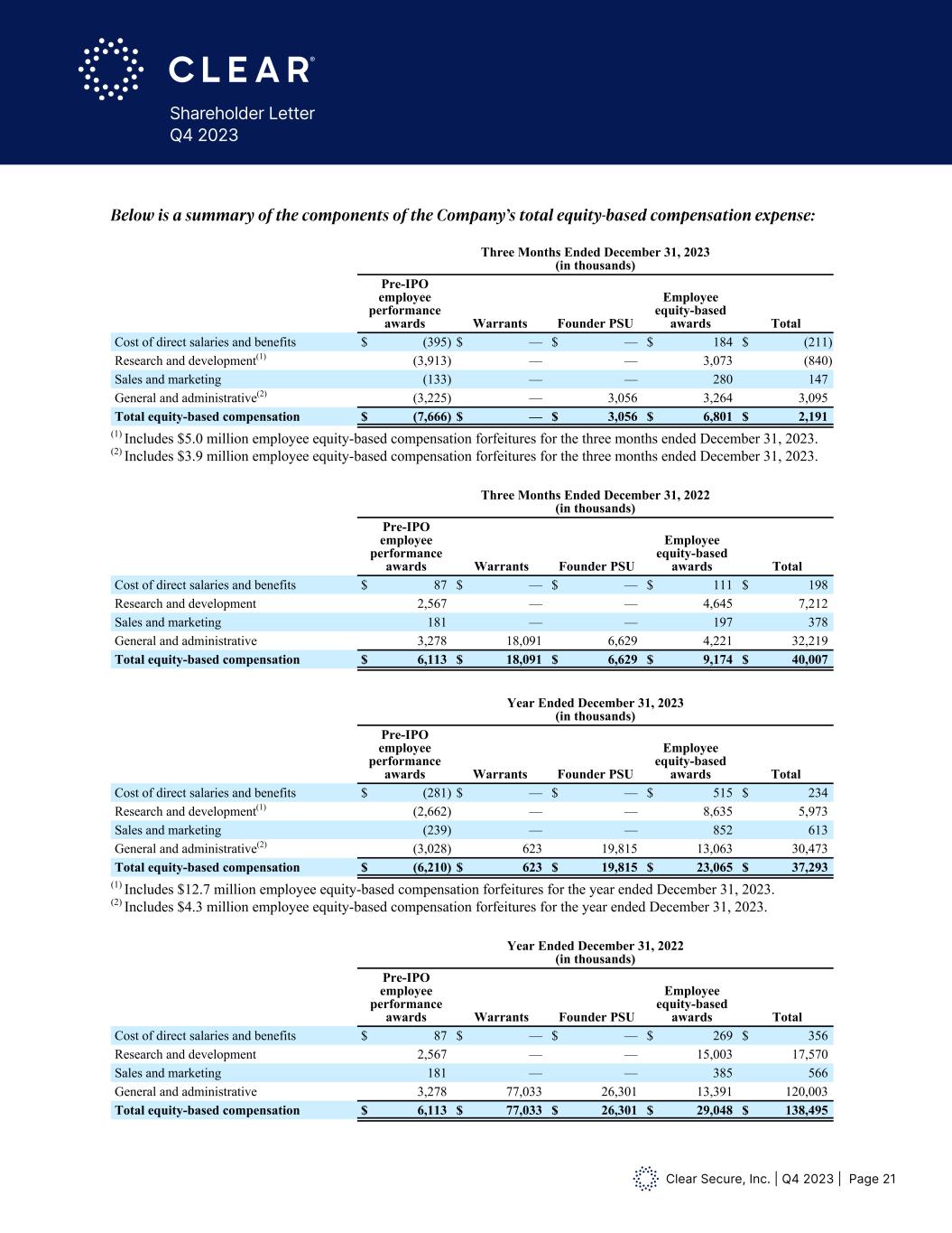 Clear Secure, Inc. | Q4 2023 | Page 21 Shareholder Letter Q4 2023 Below is a summary of the components of the Company’s total equity-based compensation expense:Below is a summary of the components of the Company’s total equity-based compensation expense: Three Months Ended December 31, 2023 (in thousands) Pre-IPO employee performance awards Warrants Founder PSU Employee equity-based awards Total Cost of direct salaries and benefits $ (395) $ — $ — $ 184 $ (211) Research and development(1) (3,913) — — 3,073 (840) Sales and marketing (133) — — 280 147 General and administrative(2) (3,225) — 3,056 3,264 3,095 Total equity-based compensation $ (7,666) $ — $ 3,056 $ 6,801 $ 2,191 (1) Includes $5.0 million employee equity-based compensation forfeitures for the three months ended December 31, 2023. (2) Includes $3.9 million employee equity-based compensation forfeitures for the three months ended December 31, 2023. Three Months Ended December 31, 2022 (in thousands) Pre-IPO employee performance awards Warrants Founder PSU Employee equity-based awards Total Cost of direct salaries and benefits $ 87 $ — $ — $ 111 $ 198 Research and development 2,567 — — 4,645 7,212 Sales and marketing 181 — — 197 378 General and administrative 3,278 18,091 6,629 4,221 32,219 Total equity-based compensation $ 6,113 $ 18,091 $ 6,629 $ 9,174 $ 40,007 Year Ended December 31, 2023 (in thousands) Pre-IPO employee performance awards Warrants Founder PSU Employee equity-based awards Total Cost of direct salaries and benefits $ (281) $ — $ — $ 515 $ 234 Research and development(1) (2,662) — — 8,635 5,973 Sales and marketing (239) — — 852 613 General and administrative(2) (3,028) 623 19,815 13,063 30,473 Total equity-based compensation $ (6,210) $ 623 $ 19,815 $ 23,065 $ 37,293 (1) Includes $12.7 million employee equity-based compensation forfeitures for the year ended December 31, 2023. (2) Includes $4.3 million employee equity-based compensation forfeitures for the year ended December 31, 2023. Year Ended December 31, 2022 (in thousands) Pre-IPO employee performance awards Warrants Founder PSU Employee equity-based awards Total Cost of direct salaries and benefits $ 87 $ — $ — $ 269 $ 356 Research and development 2,567 — — 15,003 17,570 Sales and marketing 181 — — 385 566 General and administrative 3,278 77,033 26,301 13,391 120,003 Total equity-based compensation $ 6,113 $ 77,033 $ 26,301 $ 29,048 $ 138,495