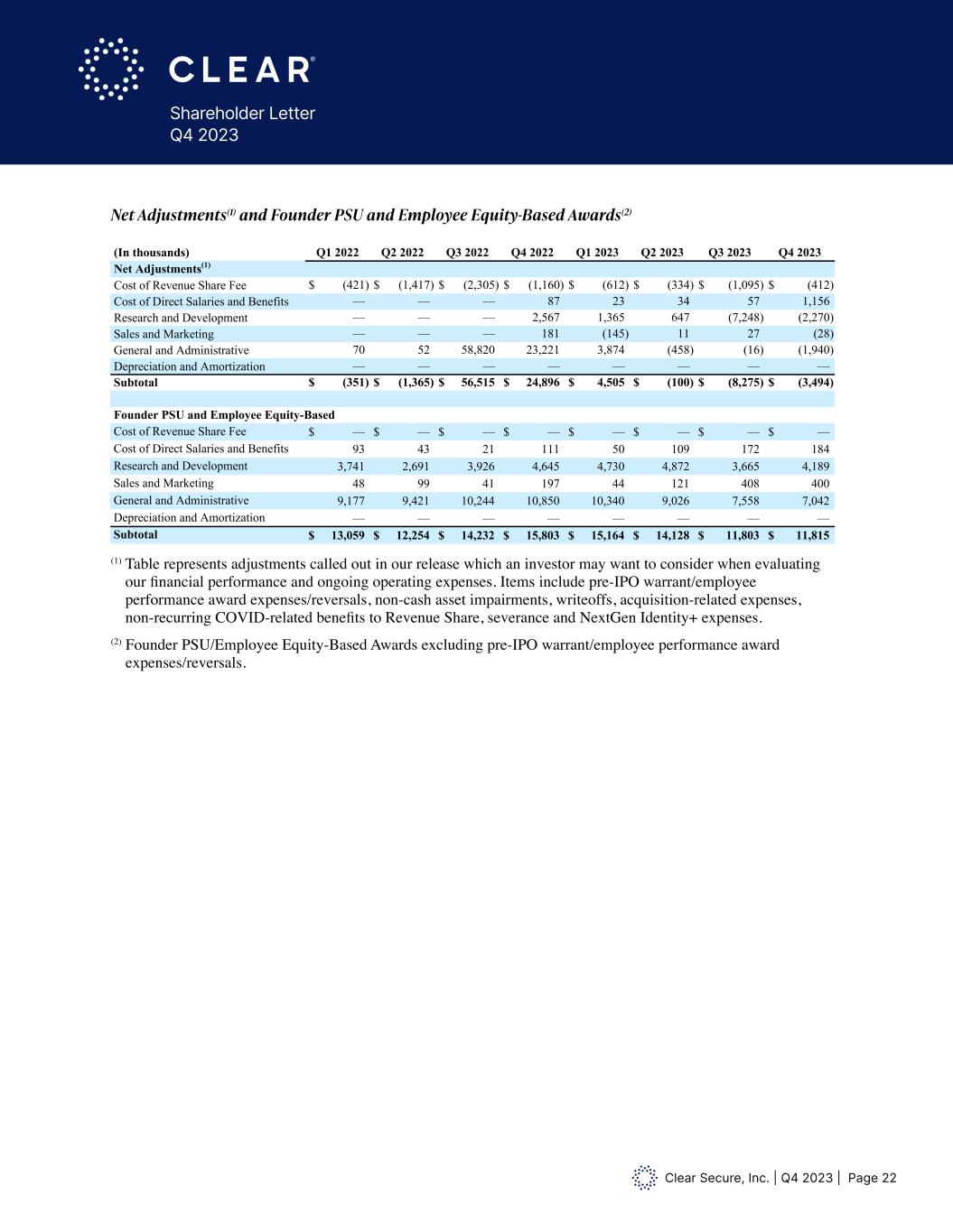 Clear Secure, Inc. | Q4 2023 | Page 22 Shareholder Letter Q4 2023 Net Adjustments(1) and Founder PSU and Employee Equity-Based Awards(2) (1) Table represents adjustments called out in our release which an investor may want to consider when evaluating our fi nancial performance and ongoing operating expenses. Items include pre-IPO warrant/employee performance award expenses/reversals, non-cash asset impairments, writeoffs, acquisition-related expenses, non-recurring COVID-related benefi ts to Revenue Share, severance and NextGen Identity+ expenses. (2) Founder PSU/Employee Equity-Based Awards excluding pre-IPO warrant/employee performance award expenses/reversals. et Adjustments(1) and Founder PSU and Employee Equity-Based Awards(2) (In thousands) Q1 2022 Q2 2022 Q3 2022 Q4 2022 Q1 2023 Q2 2023 Q3 2023 Q4 2023 Net Adjustments(1) Cost of Revenue Share Fee $ (421) $ (1,417) $ (2,305) $ (1,160) $ (612) $ (334) $ (1,095) $ (412) Cost of Direct Salaries and Benefits — — — 87 23 34 57 1,156 Research and Development — — — 2,567 1,365 647 (7,248) (2,270) Sales and Marketing — — — 181 (145) 11 27 (28) General and Administrative 70 52 58,820 23,221 3,874 (458) (16) (1,940) Depreciation and Amortization — — — — — — — — Subtotal $ (351) $ (1,365) $ 56,515 $ 24,896 $ 4,505 $ (100) $ (8,275) $ (3,494) Founder PSU and Employee Equity-Based Cost of Revenue Share Fee $ — $ — $ — $ — $ — $ — $ — $ — Cost of Direct Salaries and Benefits 93 43 21 111 50 109 172 184 Research and Development 3,741 2,691 3,926 4,645 4,730 4,872 3,665 4,189 Sales and Marketing 48 99 41 197 44 121 408 400 General and Administrative 9,177 9,421 10,244 10,850 10,340 9,026 7,558 7,042 Depreciation and Amortization — — — — — — — — Subtotal $ 13,059 $ 12,254 $ 14,232 $ 15,803 $ 15,164 $ 14,128 $ 11,803 $ 11,815