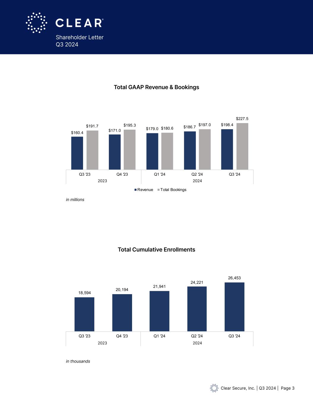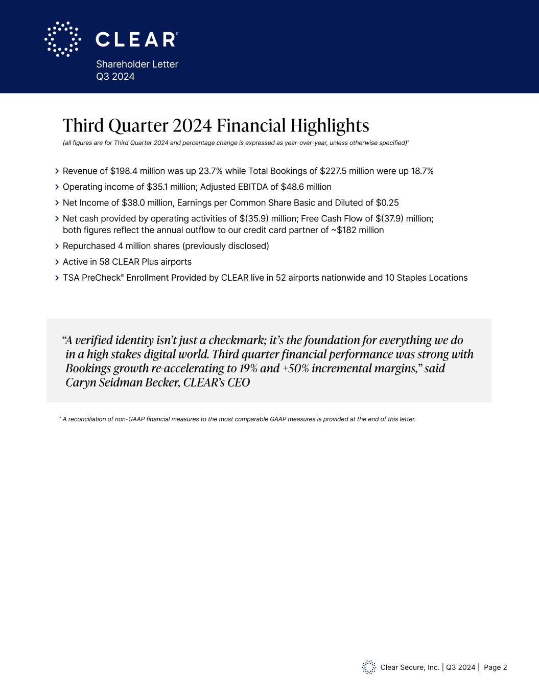 Clear Secure, Inc. | Q3 2024 | Page 2 Shareholder Letter Q3 2024 Third Quarter 2024 Financial Highlights (all figures are for Third Quarter 2024 and percentage change is expressed as year-over-year, unless otherwise specified)* Revenue of $198.4 million was up 23.7% while Total Bookings of $227.5 million were up 18.7% Operating income of $35.1 million; Adjusted EBITDA of $48.6 million Net Income of $38.0 million, Earnings per Common Share Basic and Diluted of $0.25 Net cash provided by operating activities of $(35.9) million; Free Cash Flow of $(37.9) million; both figures reflect the annual outflow to our credit card partner of ~$182 million Repurchased 4 million shares (previously disclosed) Active in 58 CLEAR Plus airports TSA PreCheck® Enrollment Provided by CLEAR live in 52 airports nationwide and 10 Staples Locations * A reconciliation of non-GAAP financial measures to the most comparable GAAP measures is provided at the end of this letter. “ A verified identity isn’t just a checkmark; it’s the foundation for everything we do in a high stakes digital world. Third quarter financial performance was strong with Bookings growth re-accelerating to 19% and +50% incremental margins,” said Caryn Seidman Becker, CLEAR’s CEO