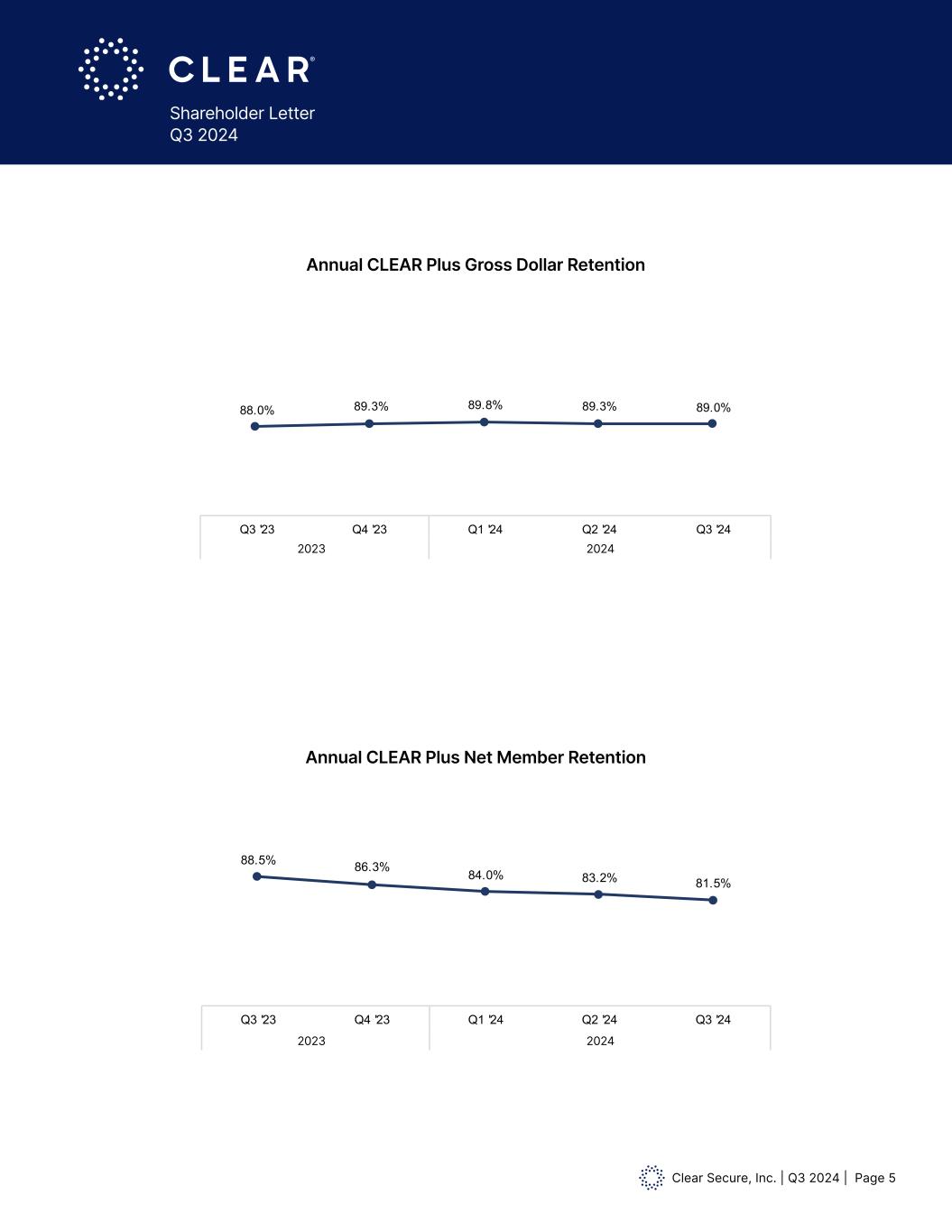 Clear Secure, Inc. | Q3 2024 | Page 4 Shareholder Letter Q3 2024 Total Cumulative Platform Uses 8.5x 8.1x 7.8x 7.4x Q3 '23 Q4 '23 Q1 '24 Q2 '24 2024 Annualized CLEAR Plus Member Usage 88.5% 86.3% Q3 '23 Q4 '23 Annual CLEAR Plus Net Member Retention 6,374 6,720 Q3 '23 Q4 '23 Acitve CLEAR Plus Members (Thousands) $160.4 $171.0 $179.0 $186.7 $198.4 $191.7 $195.3 $180.6 $197.0 $227.5 Q3 '23 Q4 '23 Q1 '24 Q2 '24 Q3 '24 2024 Total GAAP Revenue & Bookings Revenue Total Bookings 18,594 20,194 Q3 '23 Q4 '23 Total Cumulative Enrollments (Thousands) 167,417 180,807 192,610 206,673 220,413 Q3 '23 Q4 '23 Q1 '24 Q2 '24 Q3 '24 2024 Total Cumulative Platform Uses (Thousands) 88.0% 89.3% 89.8% 89.3% 89.0% Q3 '23 Q4 '23 Q1 '24 Q2 '24 Q3 '24 2024 Annual CLEAR Plus Gross Dollar Retentionin thousands Active CLEAR Plus Members $149.9 $160.4 $171.0 $179.0 $186.7 $175.1 $191.7 $195.3 $180.6 $197.0 Q2 '23 Q3 '23 Q4 '23 Q1 '24 Q2 '24 2023 2024 Total GAAP Revenue & Bookings Revenue Total Bookings 17,385 18,594 20,194 21,9 1 24,211 Q2 '23 Q3 '23 Q4 '23 Q1 '24 Q2 '24 2023 2024 Total Cumulative Enrollments (Thousands) 154,317 167,417 180,807 192,610 206,673 Q2 '23 Q3 '23 Q4 '23 Q1 '24 Q2 '24 2023 2024 Total Cumulative Platform Uses (Thousands) Annual CLEAR Plus Gross Dollar Retention 88.5% 86.3% 84.0% 83.2% 81.5% Q3 '23 Q4 '23 Q1 '24 Q2 '24 Q3 '24 2024 Annual CLEAR Plus Net Member Retention 6,374 6,720 6,798 7,095 7,150 3 ' 3 4 '23 Q1 '24 Q2 '24 Q3 '24 2024 Acitve CLEAR Plus Members (Thousands) $227.5 18,594 20,194 21,941 24,221 26,453 Q3 '23 Q4 '23 Q1 '24 Q2 '24 Q3 '24 2024 Total Cumulative Enrollments (Thousands) in thousands 2023 2023