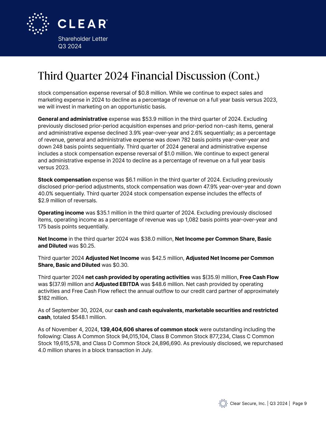 Clear Secure, Inc. | Q3 2024 | Page 9 Shareholder Letter Q3 2024 stock compensation expense reversal of $0.8 million. While we continue to expect sales and marketing expense in 2024 to decline as a percentage of revenue on a full year basis versus 2023, we will invest in marketing on an opportunistic basis. General and administrative expense was $53.9 million in the third quarter of 2024. Excluding previously disclosed prior-period acquisition expenses and prior-period non-cash items, general and administrative expense declined 3.9% year-over-year and 2.6% sequentially; as a percentage of revenue, general and administrative expense was down 782 basis points year-over-year and down 248 basis points sequentially. Third quarter of 2024 general and administrative expense includes a stock compensation expense reversal of $1.0 million. We continue to expect general and administrative expense in 2024 to decline as a percentage of revenue on a full year basis versus 2023. Stock compensation expense was $6.1 million in the third quarter of 2024. Excluding previously disclosed prior-period adjustments, stock compensation was down 47.9% year-over-year and down 40.0% sequentially. Third quarter 2024 stock compensation expense includes the effects of $2.9 million of reversals. Operating income was $35.1 million in the third quarter of 2024. Excluding previously disclosed items, operating income as a percentage of revenue was up 1,082 basis points year-over-year and 175 basis points sequentially. Net Income in the third quarter 2024 was $38.0 million, Net Income per Common Share, Basic and Diluted was $0.25. Third quarter 2024 Adjusted Net Income was $42.5 million, Adjusted Net Income per Common Share, Basic and Diluted was $0.30. Third quarter 2024 net cash provided by operating activities was $(35.9) million, Free Cash Flow was $(37.9) million and Adjusted EBITDA was $48.6 million. Net cash provided by operating activities and Free Cash Flow reflect the annual outflow to our credit card partner of approximately $182 million. As of September 30, 2024, our cash and cash equivalents, marketable securities and restricted cash, totaled $548.1 million. As of November 4, 2024, 139,404,606 shares of common stock were outstanding including the following: Class A Common Stock 94,015,104, Class B Common Stock 877,234, Class C Common Stock 19,615,578, and Class D Common Stock 24,896,690. As previously disclosed, we repurchased 4.0 million shares in a block transaction in July. Third Quarter 2024 Financial Discussion (Cont.)
