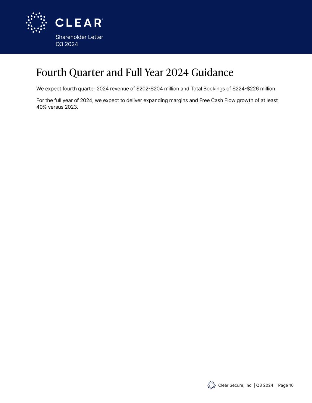 Clear Secure, Inc. | Q3 2024 | Page 10 Shareholder Letter Q3 2024 Fourth Quarter and Full Year 2024 Guidance We expect fourth quarter 2024 revenue of $202-$204 million and Total Bookings of $224-$226 million. For the full year of 2024, we expect to deliver expanding margins and Free Cash Flow growth of at least 40% versus 2023.