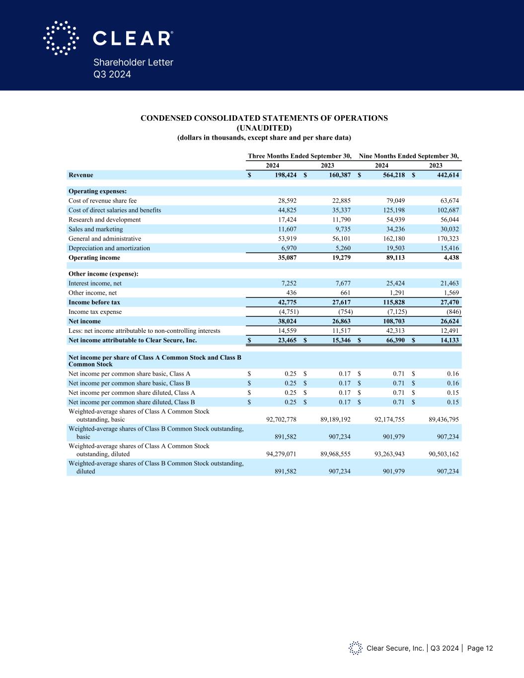 Clear Secure, Inc. | Q3 2024 | Page 12 Shareholder Letter Q3 2024 CLEAR SECURE, INC. CONDENSED CONSOLIDATED STATEMENTS OF OPERATIONS (UNAUDITED) (dollars in thousands, except share and per share data) Three Months Ended September 30, Nine Months Ended September 30, 2024 2023 2024 2023 Revenue $ 198,424 $ 160,387 $ 564,218 $ 442,614 Operating expenses: Cost of revenue share fee 28,592 22,885 79,049 63,674 Cost of direct salaries and benefits 44,825 35,337 125,198 102,687 Research and development 17,424 11,790 54,939 56,044 Sales and marketing 11,607 9,735 34,236 30,032 General and administrative 53,919 56,101 162,180 170,323 Depreciation and amortization 6,970 5,260 19,503 15,416 Operating income 35,087 19,279 89,113 4,438 Other income (expense): Interest income, net 7,252 7,677 25,424 21,463 Other income, net 436 661 1,291 1,569 Income before tax 42,775 27,617 115,828 27,470 Income tax expense (4,751) (754) (7,125) (846) Net income 38,024 26,863 108,703 26,624 Less: net income attributable to non-controlling interests 14,559 11,517 42,313 12,491 Net income attributable to Clear Secure, Inc. $ 23,465 $ 15,346 $ 66,390 $ 14,133 Net income per share of Class A Common Stock and Class B Common Stock Net income per common share basic, Class A $ 0.25 $ 0.17 $ 0.71 $ 0.16 Net income per common share basic, Class B $ 0.25 $ 0.17 $ 0.71 $ 0.16 Net income per common share diluted, Class A $ 0.25 $ 0.17 $ 0.71 $ 0.15 Net income per common share diluted, Class B $ 0.25 $ 0.17 $ 0.71 $ 0.15 Weighted-average shares of Class A Common Stock outstanding, basic 92,702,778 89,189,192 92,174,755 89,436,795 Weighted-average shares of Class B Common Stock outstanding, basic 891,582 907,234 901,979 907,234 Weighted-average shares of Class A Common Stock outstanding, diluted 94,279,071 89,968,555 93,263,943 90,503,162 Weighted-average shares of Class B Common Stock outstanding, diluted 891,582 907,234 901,979 907,234