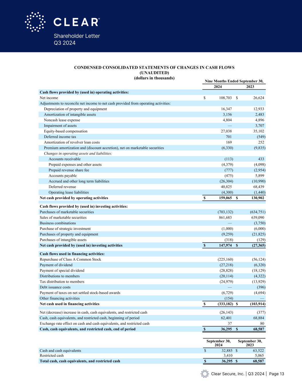 Clear Secure, Inc. | Q3 2024 | Page 13 Shareholder Letter Q3 2024 CLEAR SECURE, INC. CONDENSED CONSOLIDATED STATEMENTS OF CHANGES IN CASH FLOWS (UNAUDITED) (dollars in thousands) Nine Months Ended September 30, 2024 2023 Cash flows provided by (used in) operating activities: Net income $ 108,703 $ 26,624 Adjustments to reconcile net income to net cash provided from operating activities: Depreciation of property and equipment 16,347 12,933 Amortization of intangible assets 3,156 2,483 Noncash lease expense 4,804 4,896 Impairment of assets — 3,707 Equity-based compensation 27,038 35,102 Deferred income tax 701 (549) Amortization of revolver loan costs 169 252 Premium amortization and (discount accretion), net on marketable securities (6,330) (9,835) Changes in operating assets and liabilities: Accounts receivable (113) 433 Prepaid expenses and other assets (4,379) (4,098) Prepaid revenue share fee (777) (2,954) Accounts payable (475) 5,899 Accrued and other long term liabilities (26,304) (10,990) Deferred revenue 40,825 68,439 Operating lease liabilities (4,300) (1,440) Net cash provided by operating activities $ 159,065 $ 130,902 Cash flows provided by (used in) investing activities: Purchases of marketable securities (703,132) (634,751) Sales of marketable securities 861,683 639,090 Business combinations — (3,750) Purchase of strategic investment (1,000) (6,000) Purchases of property and equipment (9,259) (21,825) Purchases of intangible assets (318) (129) Net cash provided by (used in) investing activities $ 147,974 $ (27,365) Cash flows used in financing activities: Repurchase of Class A Common Stock (225,160) (56,124) Payment of dividend (27,218) (6,320) Payment of special dividend (28,828) (18,129) Distributions to members (20,114) (4,322) Tax distribution to members (24,979) (13,929) Debt issuance costs — (396) Payment of taxes on net settled stock-based awards (6,729) (4,694) Other financing activities (154) — Net cash used in financing activities $ (333,182) $ (103,914) Net (decrease) increase in cash, cash equivalents, and restricted cash (26,143) (377) Cash, cash equivalents, and restricted cash, beginning of period 62,401 68,884 Exchange rate effect on cash and cash equivalents, and restricted cash 37 80 Cash, cash equivalents, and restricted cash, end of period $ 36,295 $ 68,587 September 30, 2024 September 30, 2023 Cash and cash equivalents $ 32,885 $ 63,522 Restricted cash 3,410 5,065 Total cash, cash equivalents, and restricted cash $ 36,295 $ 68,587 CLEAR SECURE, INC. CONDENSED CONSOLIDATED STATEMENTS OF CHANGES IN CASH FLOWS (UNAUDITED) (dollars in thousands) Nine Months Ended September 30, 2024 2023 Cash flows provided by (used in) operating activities: Net income $ 108,703 $ 26,624 Adjustments to reconcile net income to net cash provided from operating activities: Depreciation of property and equipment 16,347 12,933 Amortization of intangible assets 3,156 2,483 Noncash lease expense 4,804 4,896 Impairment of assets — 3,707 Equity-based compensation 27,038 35,102 Deferred income tax 701 (549) Amortization of revolver loan costs 169 252 Premium amortization and (discount accretion), net on marketable securities (6,330) (9,835) Changes in operating assets and liabilities: Accounts receivable (113) 433 Prepaid expenses and other assets (4,379) (4,098) Prepaid revenue share fee (777) (2,954) Accounts payable (475) 5,899 Accrued and other long term liabilities (26,304) (10,990) Deferred revenue 40,825 68,439 Operating lease liabilities (4,300) (1,440) Net cash provided by operating activities $ 159,065 $ 130,902 Cash flows provided by (used in) investing activities: Purchases of marketable securities (703,132) (634,751) Sales of marketable securities 861,683 639,090 Business combinations — (3,750) Purchase of strategic investment (1,000) (6,000) Purchases of property and equipment (9,259) (21,825) Purchases of intangible assets (318) (129) Net cash provided by (used in) investing activities $ 147,974 $ (27,365) Cash flows used in financing activities: Repurchase of Class A Common Stock (225,160) (56,124) Payment of dividend (27,218) (6,320) Payment of special dividend (28,828) (18,129) Distributions to members (20,114) (4,322) Tax distribution to members (24,979) (13,929) Debt issuance costs — (396) Payment of taxes on net settled stock-based awards (6,729) (4,694) Other financing activities (154) — Net cash used in financing activities $ (333,182) $ (103,914) Net (decrease) increase in cash, cash equivalents, and restricted cash (26,143) (377) Cash, cash equivalents, and restricted cash, beginning of period 62,401 68,884 Exchange rate effect on cash and cash equivalents, and restricted cash 37 80 Cash, cash equivalents, and restricted cash, end of period $ 36,295 $ 68,587 September 30, 2024 September 30, 2023 Cash and cash equivalents $ 32,885 $ 63,522 Restricted cash 3,410 5,065 Total cash, cash equivalents, and restricted cash $ 36,295 $ 68,587