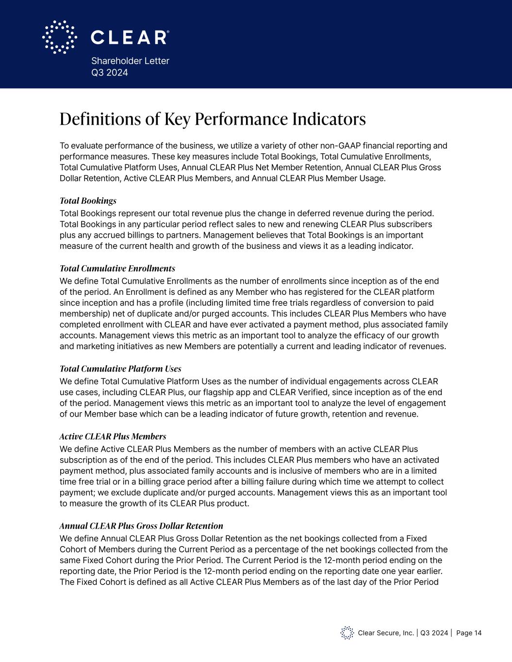 Clear Secure, Inc. | Q3 2024 | Page 14 Shareholder Letter Q3 2024 To evaluate performance of the business, we utilize a variety of other non-GAAP financial reporting and performance measures. These key measures include Total Bookings, Total Cumulative Enrollments, Total Cumulative Platform Uses, Annual CLEAR Plus Net Member Retention, Annual CLEAR Plus Gross Dollar Retention, Active CLEAR Plus Members, and Annual CLEAR Plus Member Usage. Total Bookings Total Bookings represent our total revenue plus the change in deferred revenue during the period. Total Bookings in any particular period reflect sales to new and renewing CLEAR Plus subscribers plus any accrued billings to partners. Management believes that Total Bookings is an important measure of the current health and growth of the business and views it as a leading indicator. Total Cumulative Enrollments We define Total Cumulative Enrollments as the number of enrollments since inception as of the end of the period. An Enrollment is defined as any Member who has registered for the CLEAR platform since inception and has a profile (including limited time free trials regardless of conversion to paid membership) net of duplicate and/or purged accounts. This includes CLEAR Plus Members who have completed enrollment with CLEAR and have ever activated a payment method, plus associated family accounts. Management views this metric as an important tool to analyze the efficacy of our growth and marketing initiatives as new Members are potentially a current and leading indicator of revenues. Total Cumulative Platform Uses We define Total Cumulative Platform Uses as the number of individual engagements across CLEAR use cases, including CLEAR Plus, our flagship app and CLEAR Verified, since inception as of the end of the period. Management views this metric as an important tool to analyze the level of engagement of our Member base which can be a leading indicator of future growth, retention and revenue. Active CLEAR Plus Members We define Active CLEAR Plus Members as the number of members with an active CLEAR Plus subscription as of the end of the period. This includes CLEAR Plus members who have an activated payment method, plus associated family accounts and is inclusive of members who are in a limited time free trial or in a billing grace period after a billing failure during which time we attempt to collect payment; we exclude duplicate and/or purged accounts. Management views this as an important tool to measure the growth of its CLEAR Plus product. Annual CLEAR Plus Gross Dollar Retention We define Annual CLEAR Plus Gross Dollar Retention as the net bookings collected from a Fixed Cohort of Members during the Current Period as a percentage of the net bookings collected from the same Fixed Cohort during the Prior Period. The Current Period is the 12-month period ending on the reporting date, the Prior Period is the 12-month period ending on the reporting date one year earlier. The Fixed Cohort is defined as all Active CLEAR Plus Members as of the last day of the Prior Period Definitions of Key Performance Indicators