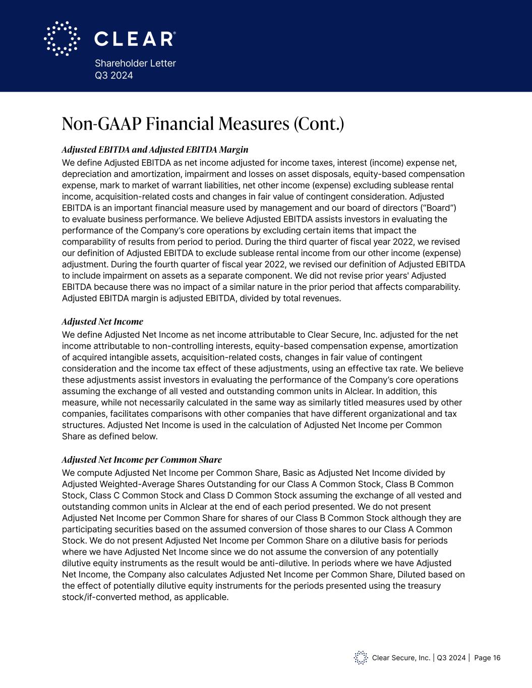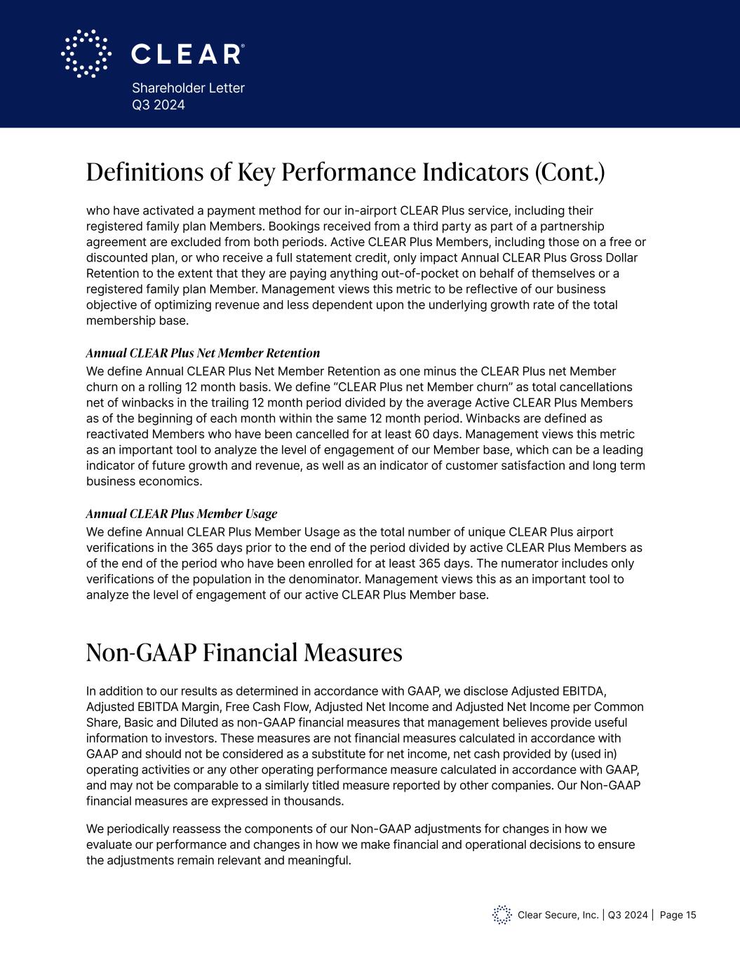 Clear Secure, Inc. | Q3 2024 | Page 15 Shareholder Letter Q3 2024 In addition to our results as determined in accordance with GAAP, we disclose Adjusted EBITDA, Adjusted EBITDA Margin, Free Cash Flow, Adjusted Net Income and Adjusted Net Income per Common Share, Basic and Diluted as non-GAAP financial measures that management believes provide useful information to investors. These measures are not financial measures calculated in accordance with GAAP and should not be considered as a substitute for net income, net cash provided by (used in) operating activities or any other operating performance measure calculated in accordance with GAAP, and may not be comparable to a similarly titled measure reported by other companies. Our Non-GAAP financial measures are expressed in thousands. We periodically reassess the components of our Non-GAAP adjustments for changes in how we evaluate our performance and changes in how we make financial and operational decisions to ensure the adjustments remain relevant and meaningful. Non-GAAP Financial Measures who have activated a payment method for our in-airport CLEAR Plus service, including their registered family plan Members. Bookings received from a third party as part of a partnership agreement are excluded from both periods. Active CLEAR Plus Members, including those on a free or discounted plan, or who receive a full statement credit, only impact Annual CLEAR Plus Gross Dollar Retention to the extent that they are paying anything out-of-pocket on behalf of themselves or a registered family plan Member. Management views this metric to be reflective of our business objective of optimizing revenue and less dependent upon the underlying growth rate of the total membership base. Annual CLEAR Plus Net Member Retention We define Annual CLEAR Plus Net Member Retention as one minus the CLEAR Plus net Member churn on a rolling 12 month basis. We define “CLEAR Plus net Member churn” as total cancellations net of winbacks in the trailing 12 month period divided by the average Active CLEAR Plus Members as of the beginning of each month within the same 12 month period. Winbacks are defined as reactivated Members who have been cancelled for at least 60 days. Management views this metric as an important tool to analyze the level of engagement of our Member base, which can be a leading indicator of future growth and revenue, as well as an indicator of customer satisfaction and long term business economics. Annual CLEAR Plus Member Usage We define Annual CLEAR Plus Member Usage as the total number of unique CLEAR Plus airport verifications in the 365 days prior to the end of the period divided by active CLEAR Plus Members as of the end of the period who have been enrolled for at least 365 days. The numerator includes only verifications of the population in the denominator. Management views this as an important tool to analyze the level of engagement of our active CLEAR Plus Member base. Definitions of Key Performance Indicators (Cont.)