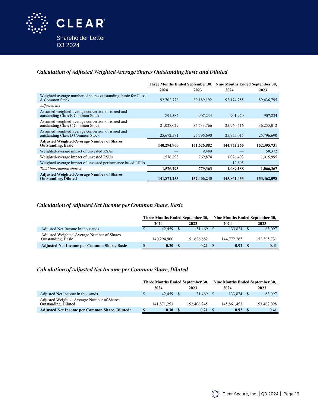 Clear Secure, Inc. | Q3 2024 | Page 19 Shareholder Letter Q3 2024 Calculation of Adjusted Weighted-Average Shares Outstanding Basic and Diluted Calculation of Adjusted Net Income per Common Share, Basic Calculation of Adjusted Net Income per Common Share, Diluted Calculation of Adjusted Weighted-Average Shares Outstanding Basic and Diluted Three Months Ended September 30, Nine Months Ended September 30, 2024 2023 2024 2023 Weighted-average number of shares outstanding, basic for Class A Common Stock 92,702,778 89,189,192 92,174,755 89,436,795 Adjustments Assumed weighted-average conversion of issued and outstanding Class B Common Stock 891,582 907,234 901,979 907,234 Assumed weighted-average conversion of issued and outstanding Class C Common Stock 21,028,029 35,733,766 25,940,516 36,255,012 Assumed weighted-average conversion of issued and outstanding Class D Common Stock 25,672,571 25,796,690 25,755,015 25,796,690 Adjusted Weighted-Average Number of Shares Outstanding, Basic 140,294,960 151,626,882 144,772,265 152,395,731 Weighted-average impact of unvested RSAs — 9,489 — 50,372 Weighted-average impact of unvested RSUs 1,576,293 769,874 1,076,493 1,015,995 Weighted-average impact of unvested performance based RSUs — — 12,695 — Total incremental shares 1,576,293 779,363 1,089,188 1,066,367 Adjusted Weighted-Average Number of Shares Outstanding, Diluted 141,871,253 152,406,245 145,861,453 153,462,098 Calculation of Adjusted Net Income per Common Share, Basic Three Months Ended September 30, Nine Months Ended September 30, 2024 2023 2024 2023 Adjusted Net Income in thousands $ 42,459 $ 31,469 $ 133,824 $ 63,097 Adjusted Weighted-Average Number of Shares Outstanding, Basic 140,294,960 151,626,882 144,772,265 152,395,731 Adjusted Net Income per Common Share, Basic $ 0.30 $ 0.21 $ 0.92 $ 0.41 Calculation of Adjusted Net Income per Common Share, Diluted Three Months Ended September 30, Nine Months Ended September 30, 2024 2023 2024 2023 Adjusted Net Income in thousands $ 42,459 $ 31,469 $ 133,824 $ 63,097 Adjusted Weighted-Average Number of Shares Outstanding, Diluted 141,871,253 152,406,245 145,861,453 153,462,098 Adjusted Net Income per Common Share, Diluted: $ 0.30 $ 0.21 $ 0.92 $ 0.41 Summary of Adjusted Net Income per Common Share Three Months Ended September 30, Nine Months Ended September 30, 2024 2023 2024 2023 Adjusted Net Income per Common Share, Basic $ 0.30 $ 0.21 $ 0.92 $ 0.41 Adjusted Net Income per Common Share, Diluted $ 0.30 $ 0.21 $ 0.92 $ 0.41 Reconciliation of Net Cash Provided by Operating Activities to Free Cash Flow Three Months Ended September 30, Nine Months Ended September 30, (In thousands) 2024 2023 2024 2023 Net cash provided by operating activities $ (35,868) $ (4,859) $ 159,065 $ 130,902 Purchases of property and equipment (2,043) (4,035) (9,259) (21,825) Free Cash Flow $ (37,911) $ (8,894) $ 149,806 $ 109,077 Calculation of Adjusted Weighted-Average Shares Outstanding Basic and Diluted Three Months Ended September 30, Nine Months Ended September 30, 024 2023 2024 2023 Weighted-average number of shares outstanding, basic for Class A Common Stock 92,702,778 89,189,192 92,174,755 89,436,795 Adjustme ts i ted-average conversion of i sued and tst i lass B o on Stock 891,582 90 ,234 90 ,979 9 7,234 ss e ei ted-average conversion of issued and outstanding lass C o on Stock 21,028,029 35,733,766 25,940,516 36,255,012 ssumed weighted-average conversion of issued and outstanding Class D Common Stock 25,672,571 25,796,690 25,755,015 25,796,690 Adjusted Weighted-Average Number of Shares Outstan ing, Basic 140,294,960 151,626,882 44,772,265 152,3 5,731 ra e i pact of unvested RSAs — 9,489 — 50,372 Weighted-average impact of unvested RSUs 1,576,293 769,874 1,076,493 1,015,995 Weight -average impact of unvested performance based RSUs — — 12,695 — Total incremental shares 1,576,293 779,363 1,089,188 1,066,367 Adjusted Weighted-Average Number of Shares Outstanding, Diluted 141,871,253 152,406,245 145,861,453 153,462,098 Calculation of Adjusted Net Income per Common Share, Basic Three Months Ended September 30, Nine Months Ended September 30, 2024 2023 2024 2023 Adjusted Net Income in thousands $ 42,459 $ 31,469 $ 133,824 $ 63,097 Adjusted Weighted-Average Number of Shares Outstanding, Basic 140,294,960 151,626,882 144,772,265 152,395,731 Adjus ed Net Incom per Common Share, Basic $ 0.30 $ 0.21 $ 0.92 $ 0.41 Calculation of Adjusted Net Income per Common Share, Diluted Three Months Ended September 30, Nine Months Ended September 30, 2024 2023 2024 2023 Adjusted Net Income in thousands $ 42,459 $ 31,469 $ 133,824 $ 63,097 Adjusted Weighted-Average Number of Shares Outstanding, Diluted 141,871,253 152,406,245 145,861,453 153,462,098 Adjusted Net Income per Com on Share, Diluted: $ 0.30 $ 0.21 $ 0.92 $ 0.41 Summary of Adjusted Net Income per Common Share Three Months Ended September 30, Nine Months Ended September 30, 2024 2023 2024 2023 Adjusted Net Income per Common Share, Basic $ 0.30 $ 0.21 $ 0.92 $ 0.41 Adjusted Net Income per Common Share, Diluted $ 0.30 $ 0.21 $ 0.92 $ 0.41 Reconciliation of Net Cash Provided by Operating Activities to Free Cash Flow Three Months Ended September 30, Nine Months Ended September 30, (In thousands) 2024 2023 2024 2023 Net cash provided by operating activities $ (35,868) $ (4,859) $ 159,065 $ 130,902 Purchases of property and equipment (2,043) (4,035) (9,259) (21,825) Free Cash Flow $ (37,911) $ (8,894) $ 149,806 $ 109,077 Calculation of Adjusted Weighted-Average Shares Outstanding Basic and Diluted Three Months Ended September 30, Nine Months Ended September 30, 2024 2023 2024 2023 Weighted-average number of shares outstanding, basic for Class A Common Stock 92,702,778 89,189,192 92,174,755 89,436,795 Adjustme ts i ted-average conversion of i sued and i lass B on Stock 891,582 907,234 901,979 907,234 ss eighted-average conversion f issued and outstanding Class C Co on Stock 21,028,029 35,733,766 25,940, 16 6,255,012 ssum weig