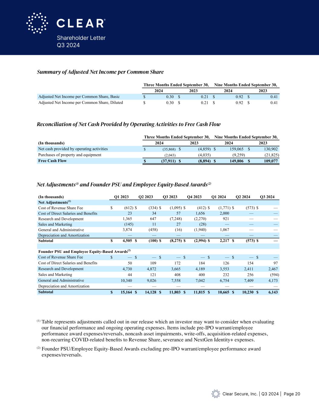 Clear Secure, Inc. | Q3 2024 | Page 20 Shareholder Letter Q3 2024 Summary of Adjusted Net Income per Common Share Reconciliation of Net Cash Provided by Operating Activities to Free Cash Flow Net Adjustments(1) and Founder PSU and Employee Equity-Based Awards(2) (1) Table represents adjustments called out in our release which an investor may want to consider when evaluating our financial performance and ongoing operating expenses. Items include pre-IPO warrant/employee performance award expenses/reversals, noncash asset impairments, write-offs, acquisition-related expenses, non-recurring COVID-related benefits to Revenue Share, severance and NextGen Identity+ expenses. (2) Founder PSU/Employee Equity-Based Awards excluding pre-IPO warrant/employee performance award expenses/reversals. Calculation of Adjusted Weighted-Average Shares Outstanding Basic and Diluted Three Months Ended September 30, Nine Months Ended September 30, 2024 2023 2024 2023 Weighted-average number of shares outstanding, basic for Class A Common Stock 92,702,778 89,189,192 92,174,755 89,436,795 Adjustments Assumed weighted-average conversion of issued and outstanding Class B Common Stock 891,582 907,234 901,979 907,234 Assumed weighted-average conversion of issued and outstanding Class C Common Stock 21,028,029 35,733,766 25,940,516 36,255,012 Assumed weighted-average conversion of issued and outstanding Class D Common Stock 25,672,571 25,796,690 25,755,015 25,796,690 Adjusted Weighted-Average Number of Shares Outstanding, Basic 140,294,960 151,626,882 144,772,265 152,395,731 Weighted-average impact of unvested RSAs — 9,489 — 50,372 Weighted-average impact of unvested RSUs 1,576,293 769,874 1,076,493 1,015,995 Weighted-average impact of unvested performance based RSUs — — 12,695 — Total incremental shares 1,576,293 779,363 1,089,188 1,066,367 Adjusted Weighted-Average Number of Shares Outstanding, Diluted 141,871,253 152,406,245 145,861,453 153,462,098 Calculation of Adjusted Net Income per Common Share, Basic Three Months Ended September 30, Nine Months Ended September 30, 2024 2023 2024 2023 Adjusted Net Income in thousands $ 42,459 $ 31,469 $ 133,824 $ 63,097 Adjusted Weighted-Average Number of Shares Outstanding, Basic 140,294,960 151,626,882 144,772,265 152,395,731 Adjusted Net Income per Common Share, Basic $ 0.30 $ 0.21 $ 0.92 $ 0.41 Calculation of Adjusted Net Income per Common Share, Diluted Three Months Ended September 30, Nine Months Ended September 30, 2024 2023 2024 2023 Adjusted Net Income in thousands $ 42,459 $ 31,469 $ 133,824 $ 63,097 Adjusted Weighted-Average Number of Shares Outstanding, Diluted 141,871,253 152,406,245 145,861,453 153,462,098 Adjusted Net Income per Common Share, Diluted: $ 0.30 $ 0.21 $ 0.92 $ 0.41 Su mary of Adjusted Net Income per Common Share Three Months Ended September 30, Nine Months Ended September 30, 2024 2023 2024 2023 Adjusted Net Income per Common Share, Basic $ 0.30 $ 0.21 $ 0.92 $ 0.41 Adjusted Net Income per Common Share, Diluted $ 0.30 $ 0.21 $ 0.92 $ 0.41 Reconciliation of Net Cash Provided by Operating Activities to Free Cash Flow Three Months Ended September 30, Nine Months Ended September 30, (In thousands) 2024 2023 2024 2023 Net cash provided by operating activities $ (35,868) $ (4,859) $ 159,065 $ 130,902 Purchases of property and equipment (2,043) (4,035) (9,259) (21,825) Free Cash Flow $ (37,911) $ (8,894) $ 149,806 $ 109,077 Calculation of Adjusted Weighted-Average Shares Outstanding Basic and Diluted Three Months Ended September 30, Nine Months Ended September 30, 2024 2023 2024 2023 Weighted-average number of shares outstanding, basic for Class Common Stock 92,702,778 89,189,192 92,174,755 89,436,795 dj stments Assumed weighted-average conversion of issued and outstanding Class B Common Stock 891,582 907,234 901,979 907,234 Assumed weighted-average conversion of issued and outstanding Class C Common Stock 21,028,029 35,733,766 25,940,516 36,255,012 Assumed weighted-average conversion of issued and outstanding Class D Common Stock 25,672,571 25,796,690 25,755,015 25,796,690 Adjusted Weighted-Average Number of Shares Outstan ing, Basic 140,294,960 151,626,882 144,772,265 152,395,731 A — 9,489 — 50,372 RSUs 1,576,293 769,874 1,076,493 1,015,995 Weighted-av rage impact of unvested performance based RSUs — — 12,695 — Total increm ntal shares 1,576,293 779,363 1,089,188 1,066,367 Adjusted Weighted-Average Number of Shares Outstanding, Diluted 141,871,253 152,406,245 145,861,453 153,462,098 Calculation of Adjusted Net Income per Common Share, Basic Three Months Ended September 30, Nine Months Ended September 30, 2024 2023 2024 2023 Net Income in thousands $ 42,459 $ 31,469 $ 133,824 $ 63,097 Adjusted Weighted-Average Number of Shares Outstanding, Basic 140,294,96 151,626,882 144,772,265 152,395,731 Adjusted Net Income per Common Share, Basic $ 0.30 $ 0.21 $ 0.92 $ 0.41 Calculation of Adjusted Net Income per Common Share, Diluted Three Months Ended September 30, Nine Months Ended September 30, 202 202 2024 2023 j t Net Income in thousands $ 42,459 $ 31,469 $ 133,824 $ 63,097 Adjusted Weighted-Average Number of Shares Outstanding, Diluted 141,871,253 152,406,245 145,861,453 153,462,098 Adjusted Net Income per Common Share, Diluted: $ 0.30 $ 0.21 $ 0.92 $ 0.41 Summary of Adjusted Net Income per Common Share Three Months Ended September 30, Nine Months Ended September 30, 2024 2023 2024 2023 djusted et Inco e per o on Share, Basic $ 0.30 $ 0.21 $ 0.92 $ 0.41 Adjusted Net Income per Common Share, Diluted $ 0.30 $ 0.21 $ 0.92 $ 0.41 Reconciliation of Net Cash Provided by Operating Activities to Free Cash Flow Three Months Ended September 30, Nine Months Ended September 30, (In thousands) 2024 2023 2024 2023 Net cash provided by operating activities $ (35,868) $ (4,859) $ 159,065 $ 130,902 Purchases of property and equipment (2,043) (4,035) (9,259) (21,825) Free Cash Flow $ (37,911) $ (8,894) $ 149,806 $ 109,077 Net Adjustments(1) and Founder PSU 